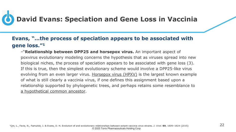 © 2025 Tonix Pharmaceuticals Holding Corp. 2015 Genetic Analysis of Vaccinia Vaccines: Horsepox - like Virus Ancestor? 1 21 “The biological origin of VACV is uncertain, although it has been suggested that a horsepox - like virus was an ancestor, even though a surviving horsepox virus (HPXV) genome harbors many extra genes ( Tulman ER, 2006 2 ). This hypothesis is supported by Jenner’s report that he obtained his later inocula from an infection in horses called “grease” ( Baxby D, 1977 3 )” 1 Qin, L., Favis , N., Famulski , J. & Evans, D. H. Evolution of and evolutionary relationships between extant vaccinia virus strains. J. Virol . 89 , 1809 – 1824 (2015) 2 Tulman ER, et al. 2006. Genome of horsepox virus. J Virol 80:9244 – 9258 . 3 Baxby D. 1977. The origins of vaccinia virus. J Infect Dis 136:453 – 455. http://dx.doi.org/10.1093/infdis/136.3.453.