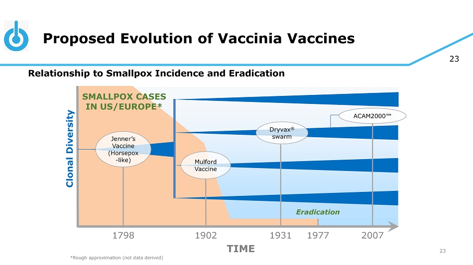 23 Relationship to Smallpox Incidence and Eradication Proposed Evolution of Vaccinia Vaccines TIME *Rough approximation (not data derived) 1977 Eradication SMALLPOX CASES IN US/EUROPE* ACAM2000 1798 1902 1931 2007 Dryvax ® swarm Mulford Vaccine Jenner’s Vaccine (Horsepox - like) Clonal Diversity 23