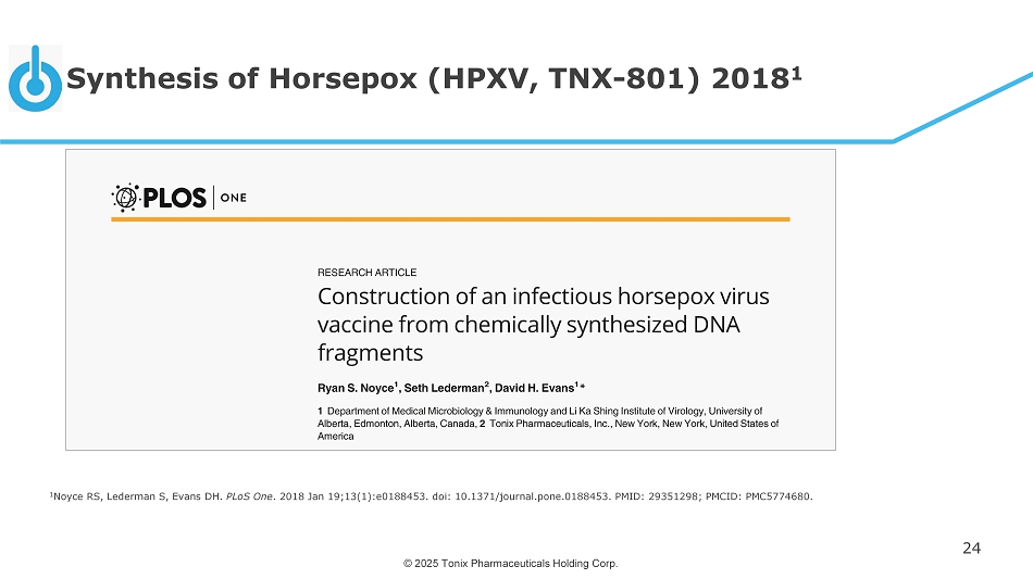 © 2025 Tonix Pharmaceuticals Holding Corp. Synthesis of Horsepox (HPXV, TNX - 801) 2018 1 24 1 Noyce RS, Lederman S, Evans DH. PLoS One . 2018 Jan 19;13(1):e0188453. doi : 10.1371/journal.pone.0188453. PMID: 29351298; PMCID: PMC5774680.