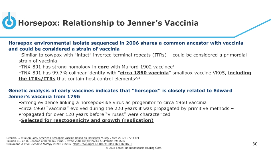© 2025 Tonix Pharmaceuticals Holding Corp. Evolution of the Vaccinia Genome 29 Recent studies (particularly from José Esparza & colleagues ) demonstrate that horsepox and horsepox - like viruses were used as smallpox vaccines in the 1800s 1 - 3 HPXV or HPXV - like Jenner’s vaccinia (cause of “ gease ” and “cowpox”) 1902 Mulford vaccine circa 1960 vaccinia The 1902 Mulford vaccine is similar to both horsepox (99.7% similar core sequence) and vaccinia ( similar ITR deletions ) Selected for WHO Eradication Intensification Program (1967) Civil War - era vaccines are genetically diverse, with some strains having 1 or both ITRs intact One recently identified strain, VK05, was found to be 99.7% similar to HPXV across the whole genome 1 Schrick L, et al. N Engl J Med. 2017;377(15):1491 - 1492 2 Duggan AT, et al. Genome Biol. 2020;21(1):175. 2 Brinkmann A, et al. Genome Biol. 2020;21(1):286.