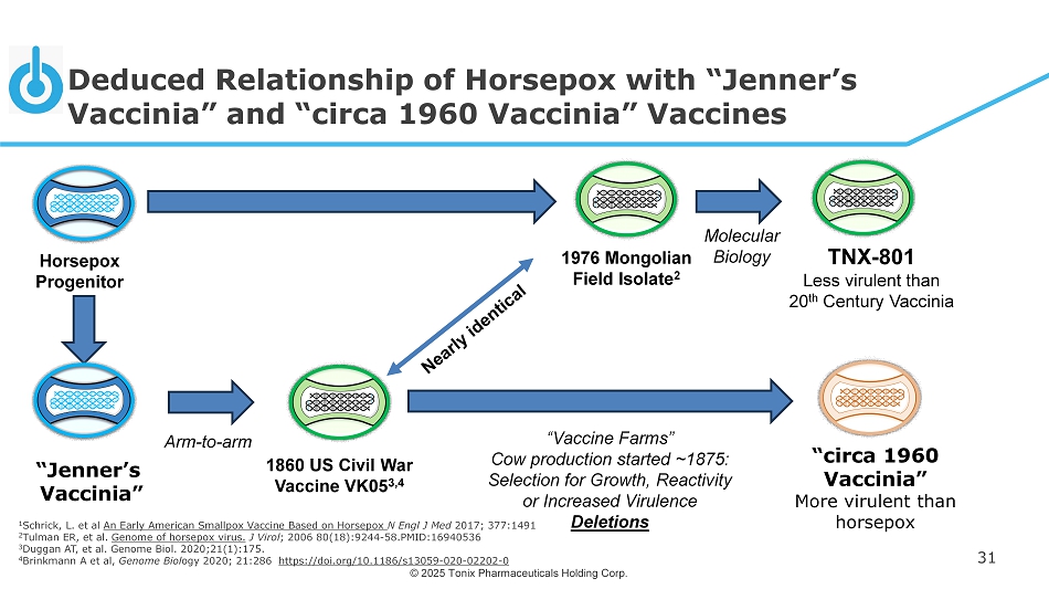 © 2025 Tonix Pharmaceuticals Holding Corp. Horsepox: Relationship to Jenner’s Vaccinia Horsepox environmental isolate sequenced in 2006 shares a common ancestor with vaccinia and could be considered a strain of vaccinia − Similar to cowpox with “intact” inverted terminal repeats (ITRs) – could be considered a primordial strain of vaccinia − TNX - 801 has strong homology in core with Mulford 1902 vaccinee 1 − TNX - 801 has 99.7% colinear identity with “ circa 1860 vaccinia ” smallpox vaccine VK05, including the LTRs/ITRs that contain host control elements 2,3 Genetic analysis of early vaccines indicates that “horsepox” is closely related to Edward Jenner’s vaccinia from 1796 − Strong evidence linking a horsepox - like virus as progenitor to circa 1960 vaccinia − circa 1960 “vaccinia” evolved during the 220 years it was propagated by primitive methods – Propagated for over 120 years before “viruses” were characterized − Selected for reactogenicity and growth (replication) 1 Schrick, L. et al An Early American Smallpox Vaccine Based on Horsepox N Engl J Med 2017; 377:1491 2 Tulman ER, et al. Genome of horsepox virus. J Virol ; 2006 80(18):9244 - 58.PMID:16940536 3 Brinkmann A et al, Genome Biol ogy 2020 ; 21:286 https://doi.org/10.1186/s13059 - 020 - 02202 - 0 30
