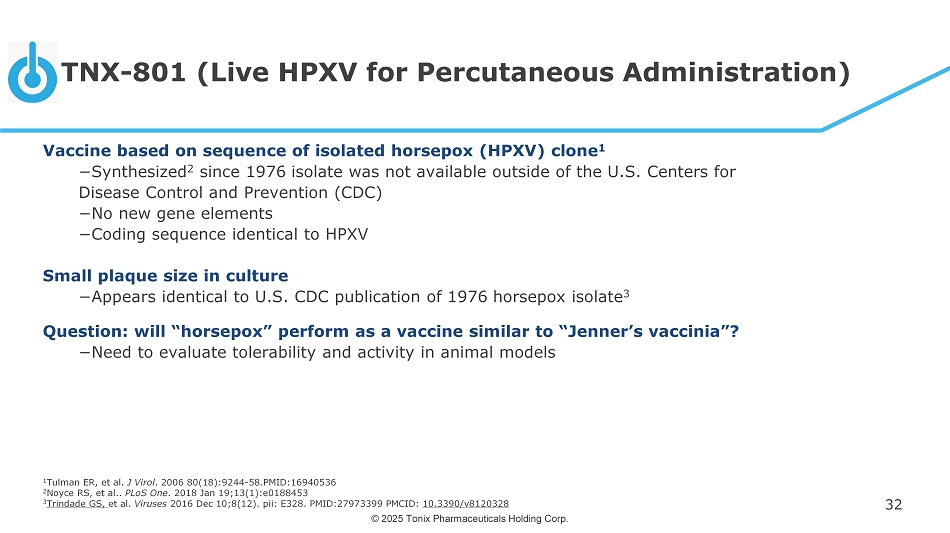 © 2025 Tonix Pharmaceuticals Holding Corp. Deduced Relationship of Horsepox with “Jenner’s Vaccinia” and “circa 1960 Vaccinia” Vaccines 1976 Mongolian Field Isolate 2 Arm - to - arm Molecular Biology “Vaccine Farms” Cow production started ~1875: Selection for Growth, Reactivity or Increased Virulence Deletions TNX - 801 Less virulent than 20 th Century Vaccinia “circa 1960 Vaccinia” More virulent than horsepox Horsepox Progenitor 1860 US Civil War Vaccine VK05 3,4 “Jenner’s Vaccinia” 1 Schrick, L. et al An Early American Smallpox Vaccine Based on Horsepox N Engl J Med 2017; 377:1491 2 Tulman ER, et al. Genome of horsepox virus. J Virol ; 2006 80(18):9244 - 58.PMID:16940536 3 Duggan AT, et al. Genome Biol. 2020;21(1):175. 4 Brinkmann A et al, Genome Biol ogy 2020 ; 21:286 https://doi.org/10.1186/s13059 - 020 - 02202 - 0 31