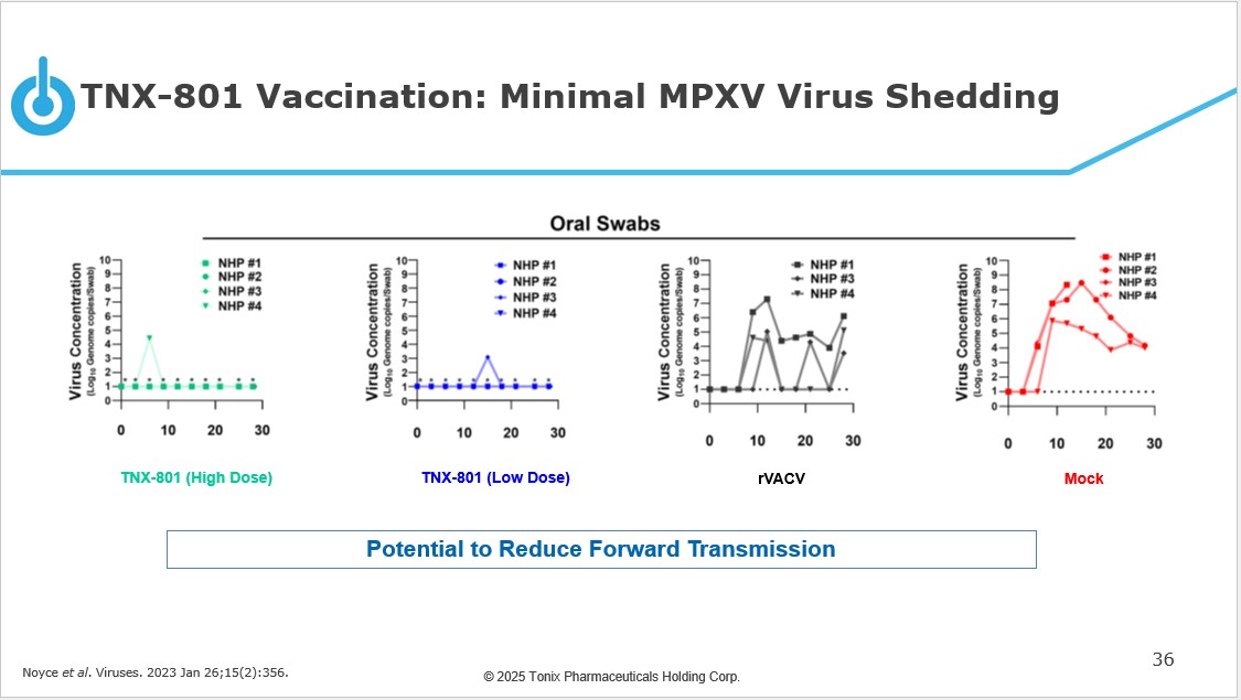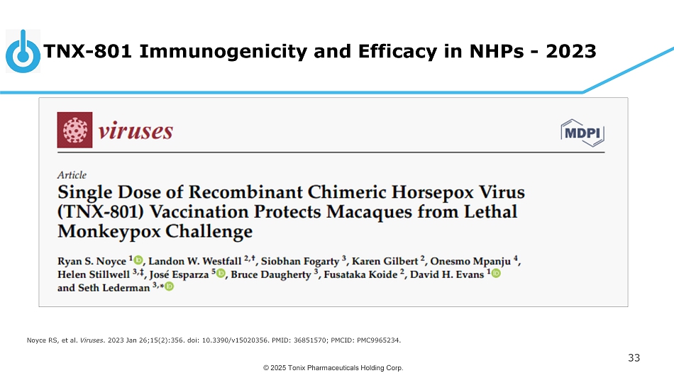 © 2025 Tonix Pharmaceuticals Holding Corp. TNX - 801 Immunogenicity and Efficacy in NHPs - 2023 33 Noyce RS, et al. Viruses . 2023 Jan 26;15(2):356. doi : 10.3390/v15020356. PMID: 36851570; PMCID: PMC9965234.