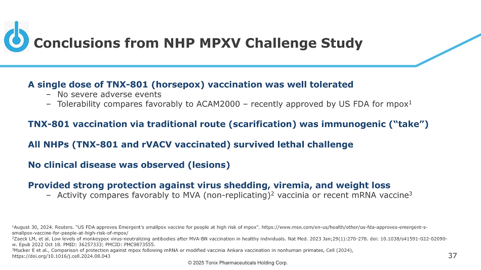 © 2025 Tonix Pharmaceuticals Holding Corp. TNX - 801 Vaccination: Minimal MPXV Virus Shedding 36 TNX - 801 (High Dose) TNX - 801 (Low Dose) rVACV Mock Potential to Reduce Forward Transmission Noyce et al . Viruses. 2023 Jan 26;15(2):356.