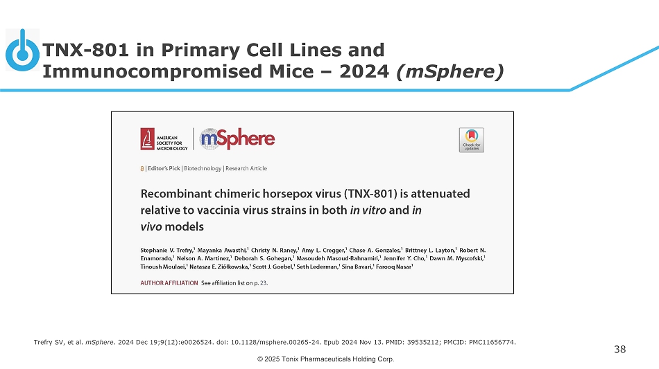 © 2025 Tonix Pharmaceuticals Holding Corp. TNX - 801 in Primary Cell Lines and Immunocompromised Mice – 2024 ( mSphere ) 38 Trefry SV, et al. mSphere . 2024 Dec 19;9(12):e0026524. doi : 10.1128/msphere.00265 - 24. Epub 2024 Nov 13. PMID: 39535212; PMCID: PMC11656774.