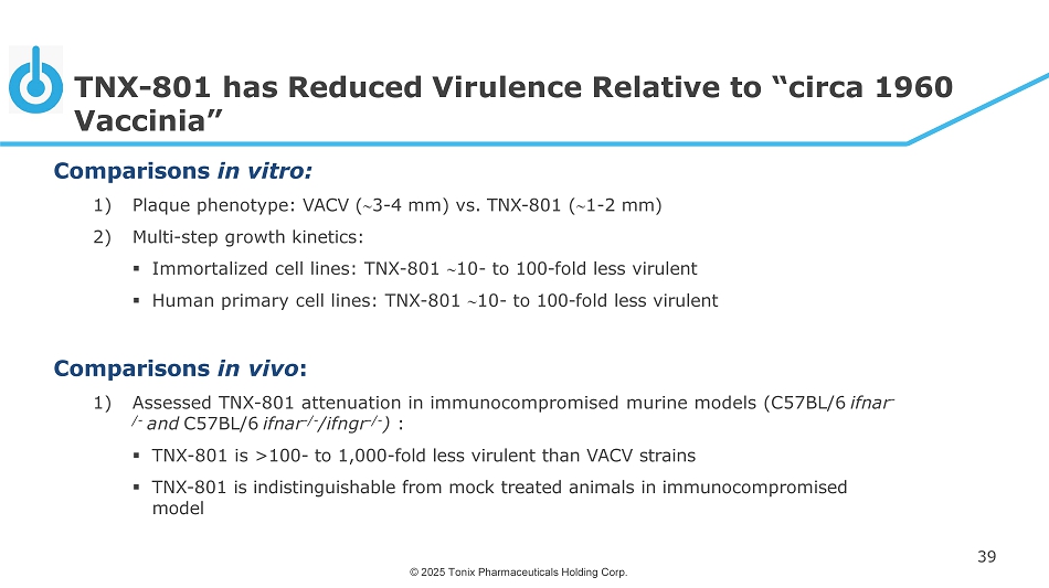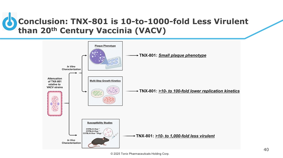 © 2025 Tonix Pharmaceuticals Holding Corp. TNX - 801 has Reduced Virulence Relative to “circa 1960 Vaccinia” 39 Comparisons in vitro: 1) Plaque phenotype: VACV ( 3 - 4 mm) vs. TNX - 801 ( 1 - 2 mm) 2) Multi - step growth kinetics: ▪ Immortalized cell lines: TNX - 801 10 - to 1 00 - fold less virulent ▪ Human primary cell lines: TNX - 801 10 - to 100 - fold less virulent Comparisons in vivo : 1) Assessed TNX - 801 attenuation in immunocompromised murine models (C57BL/6 ifnar - / - and C57BL/6 ifnar - / - / ifngr - / - ) : ▪ TNX - 801 is >100 - to 1,000 - fold less virulent than VACV strains ▪ TNX - 801 is indistinguishable from mock treated animals in immunocompromised model