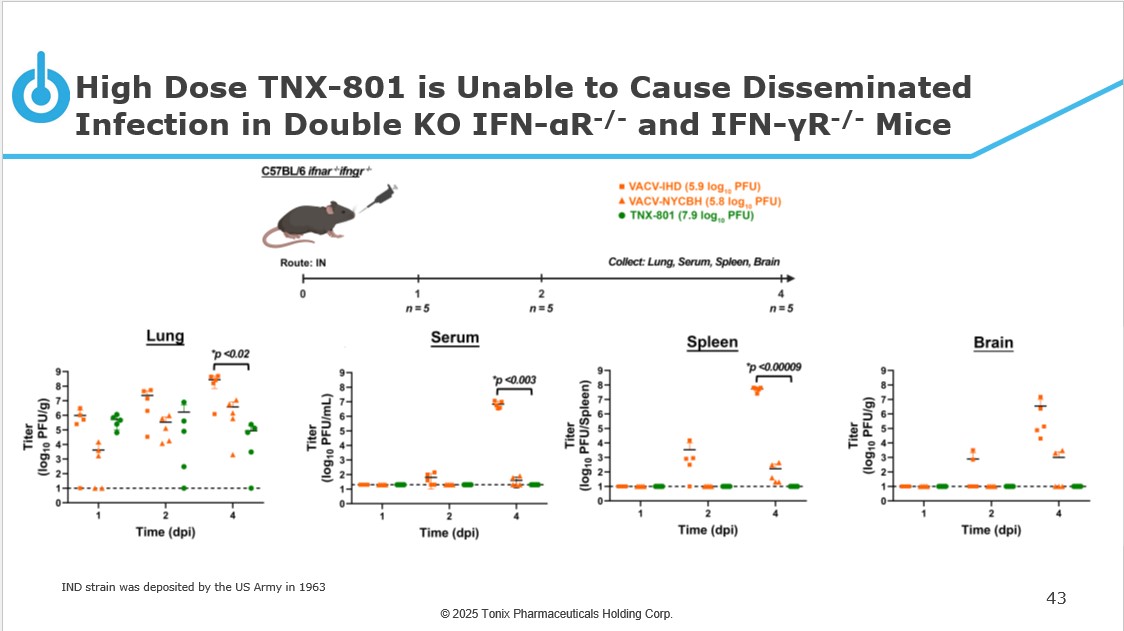 © 2025 Tonix Pharmaceuticals Holding Corp. High Dose TNX - 801 is Unable to Cause Disseminated Infection in Double KO IFN - α R - / - and IFN - γ R - / - Mice 43 IND strain was deposited by the US Army in 1963