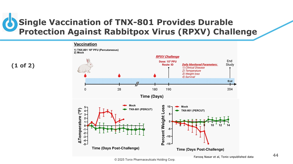 © 2025 Tonix Pharmaceuticals Holding Corp. Single Vaccination of TNX - 801 Provides Durable Protection Against Rabbitpox Virus (RPXV) Challenge 44 Farooq Nasar et al, Tonix unpublished data (1 of 2)