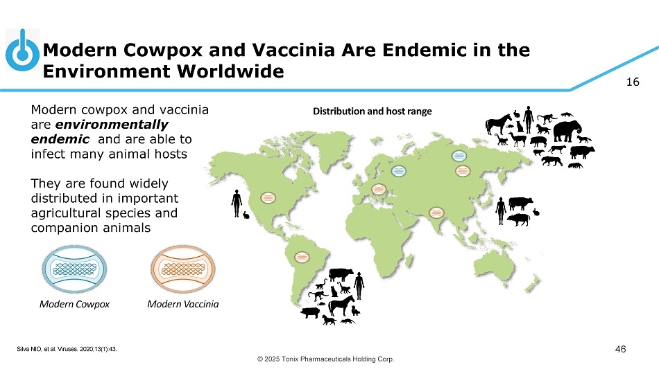 © 2025 Tonix Pharmaceuticals Holding Corp. 16 Modern Cowpox and Vaccinia Are Endemic in the Environment Worldwide 46 Modern cowpox and vaccinia are environmentally endemic and are able to infect many animal hosts They are found widely distributed in important agricultural species and companion animals Modern Cowpox Modern Vaccinia Distribution and host range Silva NIO, et al. Viruses. 2020;13(1):43.