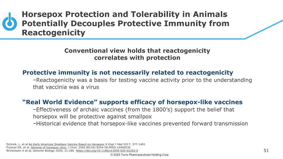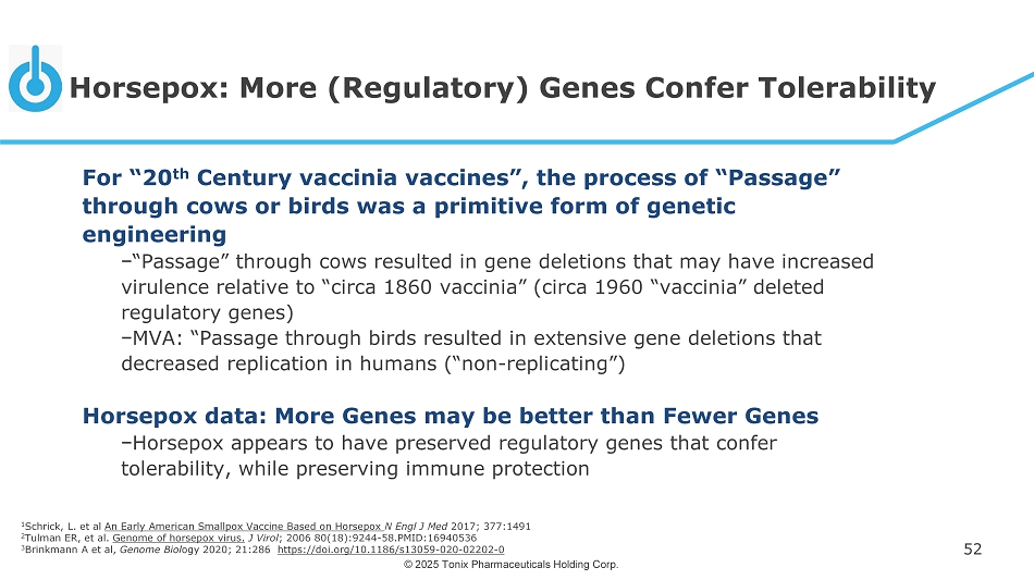 © 2025 Tonix Pharmaceuticals Holding Corp. Horsepox Protection and Tolerability in Animals Potentially Decouples Protective Immunity from Reactogenicity Conventional view holds that reactogenicity correlates with protection Protective immunity is not necessarily related to reactogenicity − Reactogenicity was a basis for testing vaccine activity prior to the understanding that vaccinia was a virus “Real World Evidence” supports efficacy of horsepox - like vaccines − Effectiveness of archaic vaccines (from the 1800’s) support the belief that horsepox will be protective against smallpox − Historical evidence that horsepox - like vaccines prevented forward transmission 1 Schrick, L. et al An Early American Smallpox Vaccine Based on Horsepox N Engl J Med 2017; 377:1491 2 Tulman ER, et al. Genome of horsepox virus. J Virol ; 2006 80(18):9244 - 58.PMID:16940536 3 Brinkmann A et al, Genome Biol ogy 2020 ; 21:286 https://doi.org/10.1186/s13059 - 020 - 02202 - 0 51