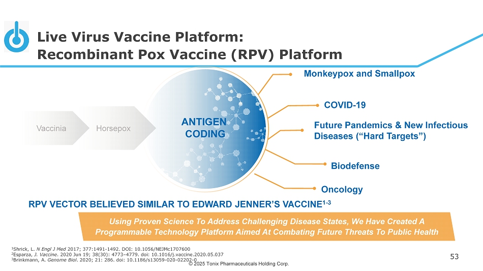 © 2025 Tonix Pharmaceuticals Holding Corp. Live Virus Vaccine Platform: Recombinant Pox Vaccine (RPV) Platform 53 Monkeypox and Smallpox Future Pandemics & New Infectious Diseases (“Hard Targets”) COVID - 19 Biodefense Using Proven Science To Address Challenging Disease States, We Have Created A Programmable Technology Platform Aimed At Combating Future Threats To Public Health Vaccinia Horsepox ANTIGEN CODING Oncology RPV VECTOR BELIEVED SIMILAR TO EDWARD JENNER’S VACCINE 1 - 3 1 Shrick, L. N Engl J Med 2017; 377:1491 - 1492. DOI: 10.1056/NEJMc1707600 2 Esparza, J. Vaccine . 2020 Jun 19; 38(30): 4773 – 4779. doi : 10.1016/j.vaccine.2020.05.037 3 Brinkmann, A. Genome Biol . 2020; 21: 286. doi : 10.1186/s13059 - 020 - 02202 - 0