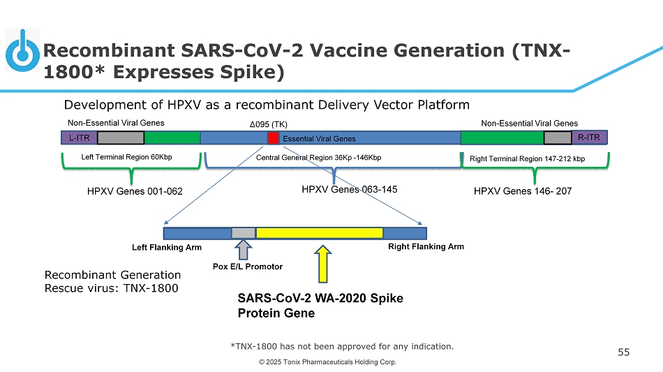 © 2025 Tonix Pharmaceuticals Holding Corp. Recombinant SARS - CoV - 2 Vaccine Generation (TNX - 1800* Expresses Spike) 55 Development of HPXV as a recombinant Delivery Vector Platform Central General Region 36Kp - 146Kbp Left Terminal Region 60Kbp Right Terminal Region 147 - 212 kbp Essential Viral Genes Non - Essential Viral Genes L - ITR Non - Essential Viral Genes R - ITR HPXV Genes 001 - 062 HPXV Genes 063 - 145 HPXV Genes 146 - 207 Δ095 (TK) Pox E/L Promotor Right Flanking Arm Left Flanking Arm Recombinant Generation Rescue virus: TNX - 1800 SARS - CoV - 2 WA - 2020 Spike Protein Gene *TNX - 1800 has not been approved for any indication.