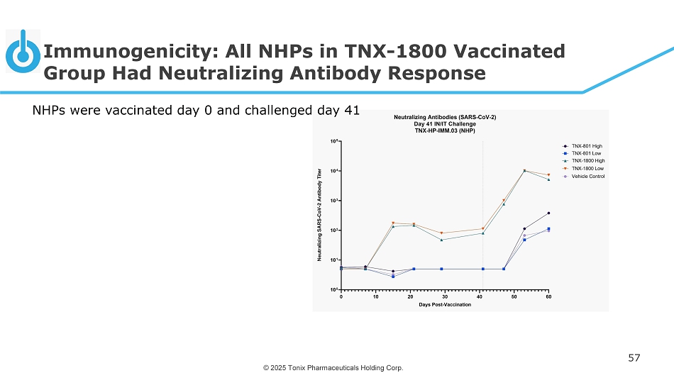 © 2025 Tonix Pharmaceuticals Holding Corp. T N X - 1 8 0 0 D i l u e n t T N X - 1 8 0 0 D i l u e n t T N X - 1 8 0 0 D i l u e n t T N X - 1 8 0 0 D i l u e n t T N X - 1 8 0 0 D i l u e n t T N X - 1 8 0 0 D i l u e n t 0 100 200 300 400 M i c r o n e u t r a l i z a t i o n T i t e r -1 Days Post-Vaccination 7 14/15 21 28/29 41 Immunogenicity: All NHPs in TNX - 1800 Vaccinated Group Had Neutralizing Antibody Response 57 NHPs were vaccinated day 0 and challenged day 41