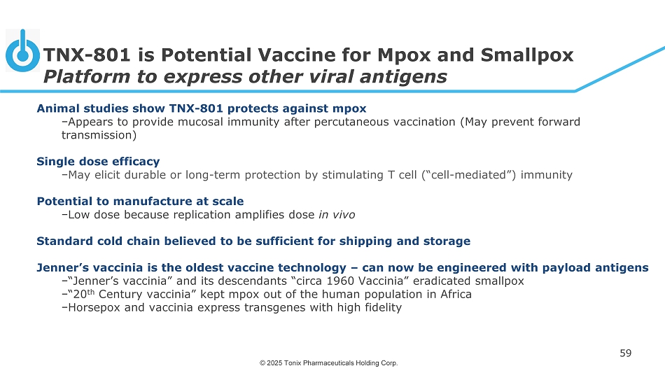 © 2025 Tonix Pharmaceuticals Holding Corp. TNX - 801 is Potential Vaccine for Mpox and Smallpox Platform to express other viral antigens Animal studies show TNX - 801 protects against mpox − Appears to provide mucosal immunity after percutaneous vaccination (May prevent forward transmission) Single dose efficacy − May elicit durable or long - term protection by stimulating T cell (“cell - mediated”) immunity Potential to manufacture at scale − Low dose because replication amplifies dose in vivo Standard cold chain believed to be sufficient for shipping and storage Jenner’s vaccinia is the oldest vaccine technology – can now be engineered with payload antigens − “Jenner’s vaccinia” and its descendants “circa 1960 Vaccinia” eradicated smallpox − “20 th Century vaccinia” kept mpox out of the human population in Africa − Horsepox and vaccinia express transgenes with high fidelity 59