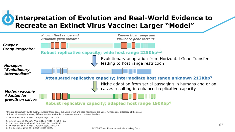 © 2025 Tonix Pharmaceuticals Holding Corp. “Classical” Technologies for Attenuating Pox Vaccines Deletions by Serial Passage vs Targeted Genomic Modification 1 62 Targeted genomic manipulation ( 1990’s) Systematic deletion of known virulence and host range factors ( e.g., Enzo Paoletti 2 and Virogenetics ) Serial Passage (1970’s) In primary chick embryo fibroblast (CEF’s) r esulting in numerous attenuating genomic deletions ( e.g., MVA) 1 Nájera JL, et al. J Virol . 2006 Jun;80(12):6033 - 47. doi : 10.1128/JVI.02108 - 05. PMID: 16731942; PMCID: PMC1472566. 2 https://en.wikipedia.org/wiki/ Enzo_Paoletti