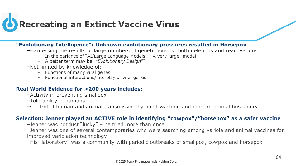 © 2025 Tonix Pharmaceuticals Holding Corp. Recreating an Extinct Vaccine Virus “Evolutionary Intelligence”: Unknown evolutionary pressures resulted in Horsepox − Harnessing the results of large numbers of genetic events: both deletions and reactivations • In the parlance of “AI/Large Language Models” – A very large “model” • A better term may be: “ Evolutionary Design ”? − Not limited by knowledge of: • Functions of many viral genes • Functional interactions/interplay of viral genes Real World Evidence for >200 years includes: − Activity in preventing smallpox − Tolerability in humans − Control of human and animal transmission by hand - washing and modern animal husbandry Selection: Jenner played an ACTIVE role in identifying “cowpox”/”horsepox” as a safer vaccine − Jenner was not just “lucky” – he tried more than once − Jenner was one of several contemporaries who were searching among variola and animal vaccines for improved variolation technology − His “laboratory” was a community with periodic outbreaks of smallpox, cowpox and horsepox 64