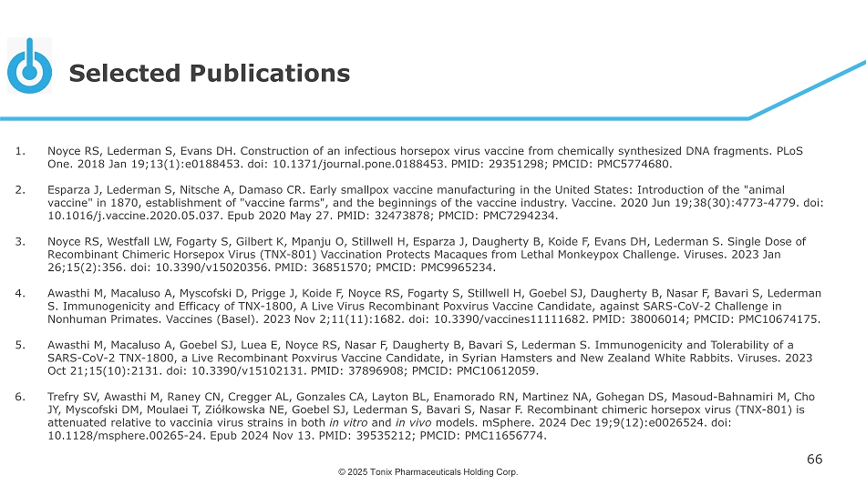 © 2025 Tonix Pharmaceuticals Holding Corp. Selected Publications 1. Noyce RS, Lederman S, Evans DH. Construction of an infectious horsepox virus vaccine from chemically synthesized DNA fragment s. PLoS One. 2018 Jan 19;13(1):e0188453. doi : 10.1371/journal.pone.0188453. PMID: 29351298; PMCID: PMC5774680. 2. Esparza J, Lederman S, Nitsche A, Damaso CR. Early smallpox vaccine manufacturing in the United States: Introduction of the " ani mal vaccine" in 1870, establishment of "vaccine farms", and the beginnings of the vaccine industry. Vaccine. 2020 Jun 19;38(30):4 773 - 4779. doi : 10.1016/j.vaccine.2020.05.037. Epub 2020 May 27. PMID: 32473878; PMCID: PMC7294234. 3. Noyce RS, Westfall LW, Fogarty S, Gilbert K, Mpanju O, Stillwell H, Esparza J, Daugherty B, Koide F, Evans DH, Lederman S. Si ngl e Dose of Recombinant Chimeric Horsepox Virus (TNX - 801) Vaccination Protects Macaques from Lethal Monkeypox Challenge. Viruses. 2023 Jan 26;15(2):356. doi : 10.3390/v15020356. PMID: 36851570; PMCID: PMC9965234. 4. Awasthi M, Macaluso A, Myscofski D, Prigge J, Koide F, Noyce RS, Fogarty S, Stillwell H, Goebel SJ, Daugherty B, Nasar F, Bav ari S, Lederman S. Immunogenicity and Efficacy of TNX - 1800, A Live Virus Recombinant Poxvirus Vaccine Candidate, against SARS - CoV - 2 Challenge in Nonhuman Primates. Vaccines (Basel). 2023 Nov 2;11(11):1682. doi : 10.3390/vaccines11111682. PMID: 38006014; PMCID: PMC10674175. 5. Awasthi M, Macaluso A, Goebel SJ, Luea E, Noyce RS, Nasar F, Daugherty B, Bavari S, Lederman S. Immunogenicity and Tolerabili ty of a SARS - CoV - 2 TNX - 1800, a Live Recombinant Poxvirus Vaccine Candidate, in Syrian Hamsters and New Zealand White Rabbits. Viruses. 2 023 Oct 21;15(10):2131. doi : 10.3390/v15102131. PMID: 37896908; PMCID: PMC10612059. 6. Trefry SV, Awasthi M, Raney CN, Cregger AL, Gonzales CA, Layton BL, Enamorado RN, Martinez NA, Gohegan DS, Masoud - Bahnamiri M, C ho JY, Myscofski DM, Moulaei T, Ziółkowska NE, Goebel SJ, Lederman S, Bavari S, Nasar F. Recombinant chimeric horsepox virus (TN X - 8 01) is attenuated relative to vaccinia virus strains in both in vitro and in vivo models. mSphere . 2024 Dec 19;9(12):e0026524. doi : 10.1128/msphere.00265 - 24. Epub 2024 Nov 13. PMID: 39535212; PMCID: PMC11656774. 66