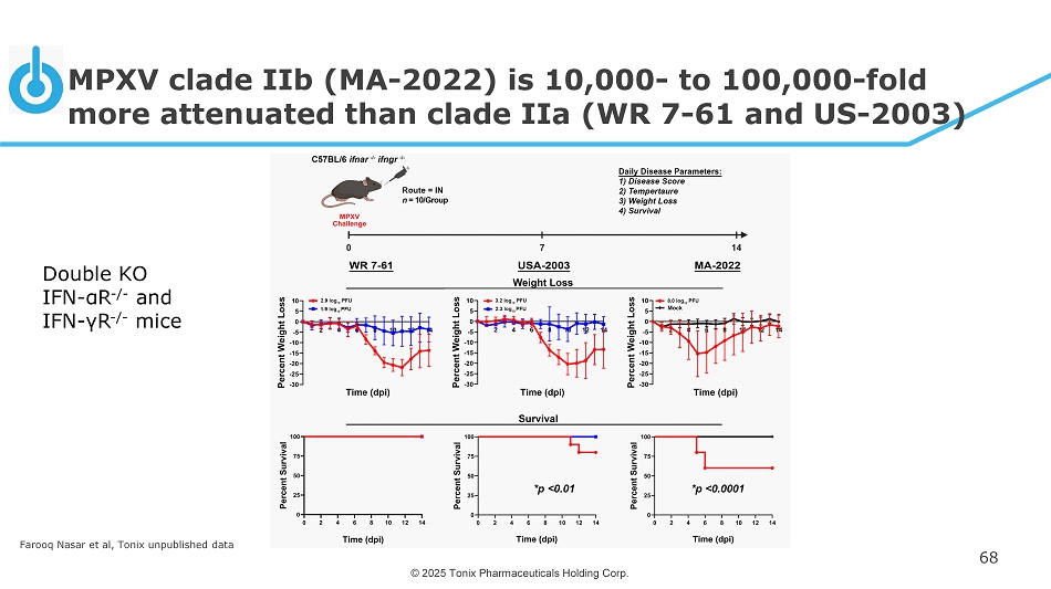 © 2025 Tonix Pharmaceuticals Holding Corp. MPXV clade IIb (MA - 2022) is 10,000 - to 100,000 - fold more attenuated than clade IIa (WR 7 - 61 and US - 2003) 68 *p <0.0001 *p <0.01 Farooq Nasar et al, Tonix unpublished data Double KO IFN - α R - / - and IFN - γ R - / - mice