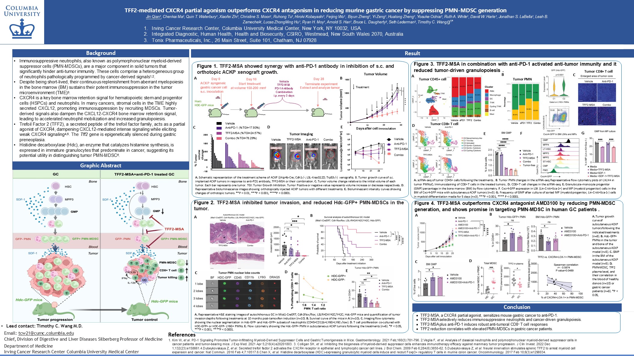 Conclusion 1. Kim W, et al . PD - 1 Signaling Promotes Tumor - Infiltrating Myeloid - Derived Suppressor Cells and Gastric Tumorigenesis in Mice. Gastroenterology. 2021 Feb;160(3):781 - 796. 2.Veglia F, et al . Analysis of classical neutrophils and polymorphonuclear myeloid - derived suppressor cells in cancer patients and tumor - bearing mice. J Exp Med. 2021 Apr 5;218(4):e20201803. 3. Colligan SH, et al . Inhibiting the biogenesis of myeloid - derived suppressor cells enhances immunotherapy efficacy against mammary tumor progression. J Clin Invest. 2022 Dec 1;132(23):e158661.4.Dubeykovskaya Z, et al . Secreted trefoil factor 2 activates the CXCR4 receptor in epithelial and lymphocytic cancer cell lines. J Biol Chem. 2009 Feb 6;284(6):3650 - 62. 5.Dubeykovskaya Z, et al . Neural innervation stimulates splenic TFF2 to arrest myeloid cell expansion and cancer. Nat Commun. 2016 Feb 4;7:10517.6.Chen X, et al . Histidine decarboxylase (HDC) - expressing granulocytic myeloid cells induce and recruit Foxp3+ regulatory T cells in murine colon cancer. Oncoimmunology. 2017 Feb 10;6(3):e1290034. Background • Immunosuppressive neutrophils, also known as polymorphonuclear myeloid - derived suppressor cells (PMN - MDSCs), are a major component in solid tumors that significantly hinder anti - tumor immunity. These cells comprise a heterogeneous group of neutrophils pathologically programmed by cancer - derived signals 1,2 . • Despite being short - lived, their continuous replenishment from aberrant myelopoiesis in the bone marrow (BM) sustains their potent immunosuppression in the tumor microenvironment (TME) 3 . • CXCR4 is a key bone marrow retention signal for hematopoietic stem and progenitor cells (HSPCs) and neutrophils . In many cancers, stromal cells in the TME highly secreted CXCL 12 , promoting immunosuppression by recruiting MDSCs . Tumor - derived signals also dampen the CXCL 12 - CXCR 4 bone marrow retention signal, leading to accelerated neutrophil mobilization and increased granulopoiesis . • Trefoil Factor 2 (TFF 2 ), a secreted peptide of the trefoil factor family, acts as a partial agonist of CXCR 4 , dampening CXCL 12 - mediated intense signaling while eliciting weak CXCR 4 signaling 4 , 5 . The Tff 2 gene is epigenetically silenced during gastric preneoplasia . • Histidine decarboxylase (Hdc), an enzyme that catalyzes histamine synthesis, is expressed in immature granulocytes that predominate in cancer, suggesting its potential utility in distinguishing tumor PMN - MDSC 6 . Graphic Abstract Figure 1. TFF2 - MSA showed synergy with anti - PD - 1 antibody in inhibition of s.c. and orthotopic ACKP xenograft growth. Figure 2. TFF2 - MSA inhibited tumor invasion, and reduced Hdc - GFP+ PMN - MDSCs in the tumor. Figure 3. TFF2 - MSA in combination with anti - PD - 1 activated anti - tumor immunity and it reduced tumor - driven granulopoiesis .  TFF2 - MSA, a CXCR4 partial agonist, sensitizes mouse gastric cancer to anti - PD - 1.  TFF2 - MSA selectively reduces immunosuppressive neutrophils and cancer - driven granulopoiesis.  TFF2 - MSA plus anti - PD - 1 induces robust anti - tumoral CD8 + T cell responses  TFF2 reduction correlates with elevated PMN - MDSCs in gastric cancer patients. Tumor Volume % Tumor volume change Vehicle Anti - PD - 1 (%TGI=17.93%) TFF2 - MSA (%TGI=24.57%) Combo (%TGI=78.29%) 30 0 0 500 1000 1500 Tumor volume (mm 3 ) Treatment ns ns ٓ ٓ ٓ ٓ A B C Vehicle Tumor Imaging TFF2 - MSA Anti - PD - 1 Combo D E 7 14 21 28 10 10 10 9 10 8 10 7 10 6 10 5 10 4 10 3 ٓ ٓ ٓ ٓ ٓ ٓ ٓ ٓ 500 1000 1500 2000 0 - 100 Vehicle Anti - PD - 1 TFF2 - MSA Combo 10 20 Days after cell innoculation Luminescence (p/sec/cm 2/ sr) A A. Schematic representation of the treatment scheme of ACKP ((Atp4b - Cre; Cdh1 - / - ; LSL - KrasG12D; Trp53 - / - ) xenografts. B. Tumor growth curve of s.c. implanted ACKP tumors in response to anti - PD1 antibody, TFF2 - MSA or their combination. C. Tumor volume change relative to the initial volume of each tumor. Each bar represents one tumor. TGI: Tumor Growth Inhibition. Tumor Positive or negative value represents volume increase or decrease respectively. D . Representative bioluminescence images showing orthotopically injected ACKP tumors with different treatments. E. Bioluminescent intensity curves showing changes of orthotopic tumors. **P < 0.01, ***P < 0.001, ****P < 0.0001. A. Representative H&E staining images of autochthonous GC in Mist1 - CreERT; Cdh1flox/flox; LSLRHOAY42C/Y42C; Hdc - GFP mice and quantification of tumor invasion depths following treatments at 10 months post - tamoxifen induction (n=10). B. Survival curve of the mice in A (n=10) . C. Imaging flow cytometry showing the nuclear segmentation in Hdc - GFP - and Hdc - GFP+ subsets of neutrophils (CD45+CD11b+LY6G+LY6C - /low). D . T cell proliferation co - cultured with HDC - GFP+ or HDC - GFP - LY6G+ PMNs. E. Flow cytometry showing the Hdc - GFP+ PMN in subcutaneous ACKP tumors following the treatments (n=6). *P < 0.05, ***P < 0.001, ****P < 0.0001. References A. Tumor growth curve of subcutaneous ACKP tumors following the indicated treatments (n=8). B. Hdc - GFP+ PMNs in the tumor and bone of the subcutaneous ACKP model (n=5). C. GMP in the BM of the subcutaneous ACKP model (n=5). D. PMN - MDSC, TFF2 plasma level, and their correlation in the blood of healthy donors (n=10) or gastric cancer patients (n=8). *P < 0.05, A. scRNA - seq of tumor CD45+ cells following the treatments.. B . Tumor PMN changes in the scRNA - seq Representative flow cytometry plots of CXCR4 in tumor PMNs. C. Immunostaining of CD8+ T cells in the treated tumors.. D. CD8+ T cell changes in the scRNA - seq. E. Granulocyte - monocyte progenitor (GMP) percentage in the bone marrow (BM) by flow cytometry. F . Cxcr4 - GFP expression in LSK (Lin - C - kit+Sca - 1+) and MP (myeloid progenitor) cells in the BM of Cxcr4 - GFP mice with subcutaneous ACKP tumors (n=3). G. Frequency of GMP after culture of sor