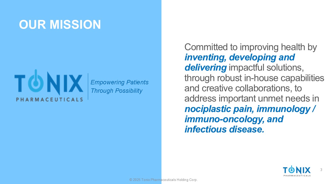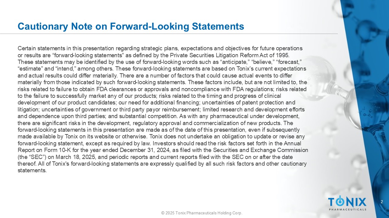 2 © 2025 Tonix Pharmaceuticals Holding Corp. Cautionary Note on Forward - Looking Statements Certain statements in this presentation regarding strategic plans, expectations and objectives for future operations or results are “forward - looking statements” as defined by the Private Securities Litigation Reform Act of 1995. These statements may be identified by the use of forward - looking words such as “anticipate,” “believe,” “forecast,” “estimate” and “intend,” among others. These forward - looking statements are based on Tonix’s current expectations and actual results could differ materially. There are a number of factors that could cause actual events to differ materially from those indicated by such forward - looking statements. These factors include, but are not limited to, the risks related to failure to obtain FDA clearances or approvals and noncompliance with FDA regulations; risks related to the failure to successfully market any of our products; risks related to the timing and progress of clinical development of our product candidates; our need for additional financing; uncertainties of patent protection and litigation; uncertainties of government or third party payor reimbursement; limited research and development efforts and dependence upon third parties; and substantial competition. As with any pharmaceutical under development, there are significant risks in the development, regulatory approval and commercialization of new products. The forward - looking statements in this presentation are made as of the date of this presentation, even if subsequently made available by Tonix on its website or otherwise. Tonix does not undertake an obligation to update or revise any forward - looking statement, except as required by law. Investors should read the risk factors set forth in the Annual Report on Form 10 - K for the year ended December 31, 2024, as filed with the Securities and Exchange Commission (the “SEC”) on March 18 , 202 5 , and periodic reports and current reports filed with the SEC on or after the date thereof. All of Tonix's forward - looking statements are expressly qualified by all such risk factors and other cautionary statements.