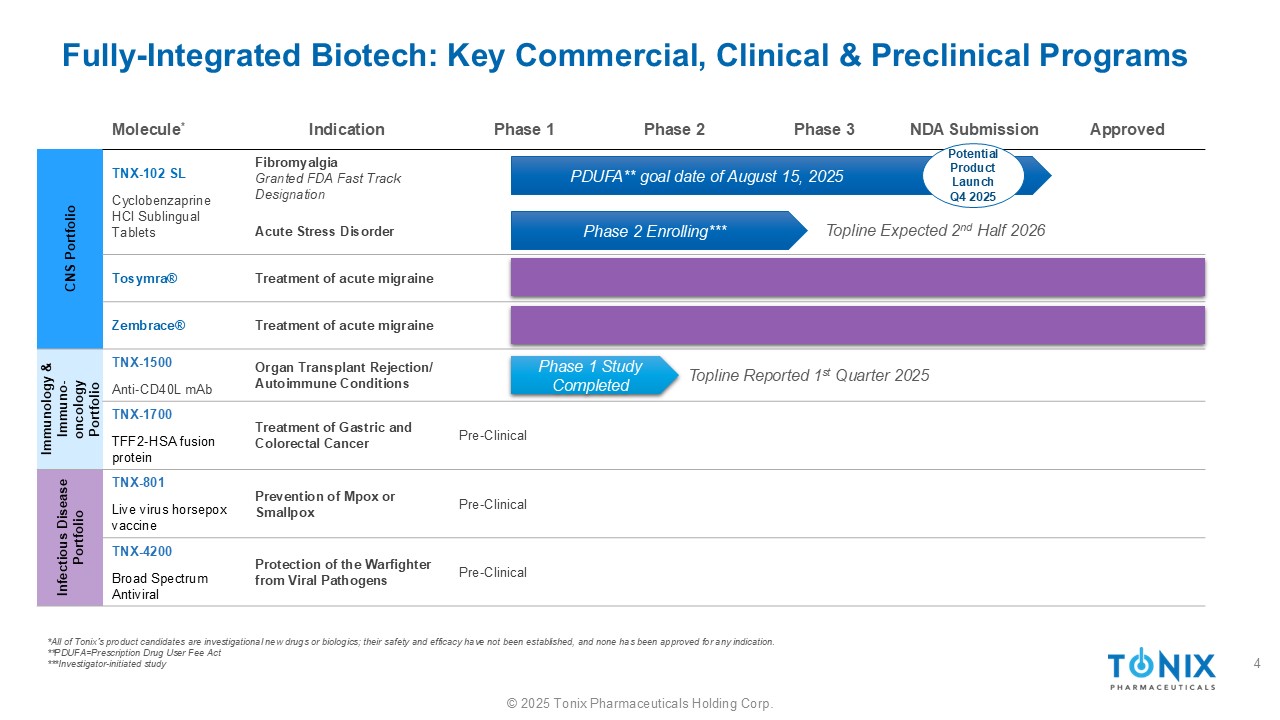 © 2025 Tonix Pharmaceuticals Holding Corp. OUR MISSION Committed to improving health by inventing, developing and delivering impactful solutions, through robust in - house capabilities and creative collaborations, to address important unmet needs in nociplastic pain, immunology / immuno - oncology, and infectious disease. Empowering Patients Through Possibility 3