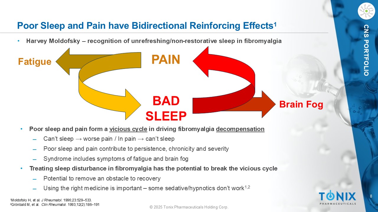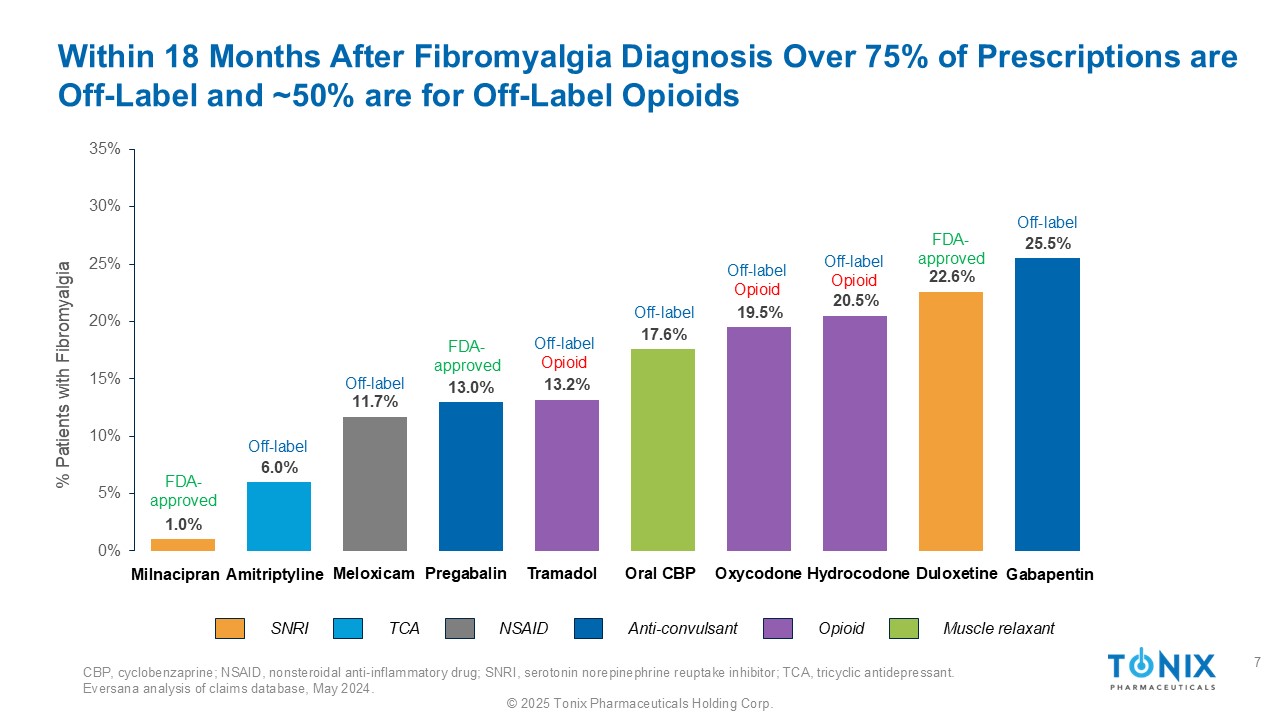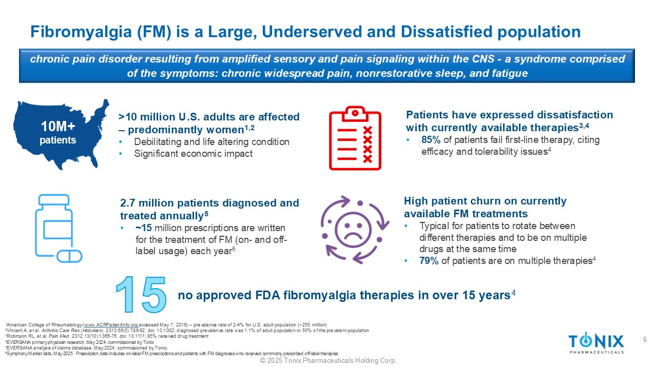 © 2025 Tonix Pharmaceuticals Holding Corp. Fibromyalgia (FM) is a Large, Underserved and Dissatisfied population chronic pain disorder resulting from amplified sensory and pain signaling within the CNS - a syndrome comprised of the symptoms: chronic widespread pain, nonrestorative sleep, and fatigue 2.7 million patients diagnosed and treated annually 5 • ~15 million prescriptions are written for the treatment of FM (on - and off - label usage) each year 6 10M+ patients >10 million U.S. adults are affected – predominantly women 1,2 • Debilitating and life altering condition • Significant economic impact Patients have expressed dissatisfaction with currently available therapies 3,4 • 85% of patients fail first - line therapy, citing efficacy and tolerability issues 4 High patient churn on currently available FM treatments • Typical for patients to rotate between different therapies and to be on multiple drugs at the same time • 79% of patients are on multiple therapies 4 no approved FDA fibromyalgia therapies in over 15 years 4 1 American College of Rheumatology ( www.ACRPatientInfo.org accessed May 7, 2019) – prevalence rate of 2 - 4% for U.S. adult population (~250 million) 2 Vincent A, et al. Arthritis Care Res (Hoboken) . 2013 65(5):786 - 92. doi: 10.1002 ; diagnosed prevalence rate was 1.1% of adult population or 50% of the prevalent population 3 Robinson RL, et al. Pain Med . 2012 13(10):1366 - 76. doi: 10.1111; 85% received drug treatment 4 EVERSANA primary physician research, May 2024; commissioned by Tonix 5 EVERSANA analysis of claims database, May 2024, commissioned by Tonix. 6 Symphony Market data, May 2025. Prescription data includes on - label FM prescriptions and patients with FM diagnoses who receive d commonly prescribed off - label therapies 6