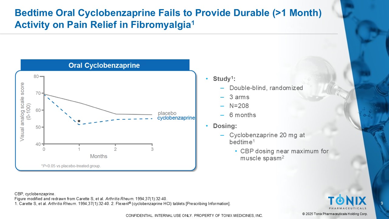 8 © 2025 Tonix Pharmaceuticals Holding Corp. CNS PORTFOLIO Poor Sleep and Pain have Bidirectional Reinforcing Effects 1 1 Moldofsky H, et al. J Rheumatol . 1996;23:529 – 533. 2 Grönbald M, et al. Clin Rheumatol . 1993;12(2):186 – 191 • Harvey Moldofsky – recognition of unrefreshing/non - restorative sleep in fibromyalgia • Poor sleep and pain form a vicious cycle in driving fibromyalgia decompensation ̶ Can’t sleep → worse pain / In pain → can’t sleep ̶ Poor sleep and pain contribute to persistence, chronicity and severity ̶ Syndrome includes symptoms of fatigue and brain fog • Treating sleep disturbance in fibromyalgia has the potential to break the vicious cycle ̶ Potential to remove an obstacle to recovery ̶ Using the right medicine is important – some sedative/hypnotics don’t work 1,2 PAIN BAD SLEEP Fatigue Brain Fog