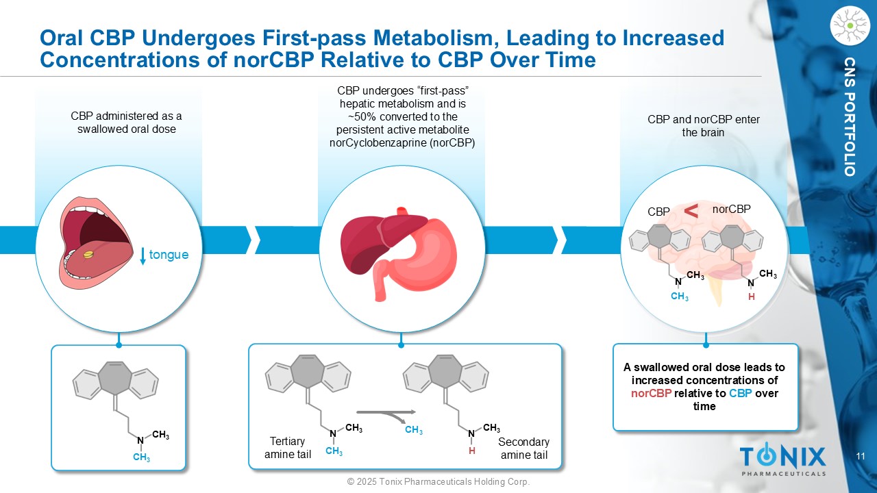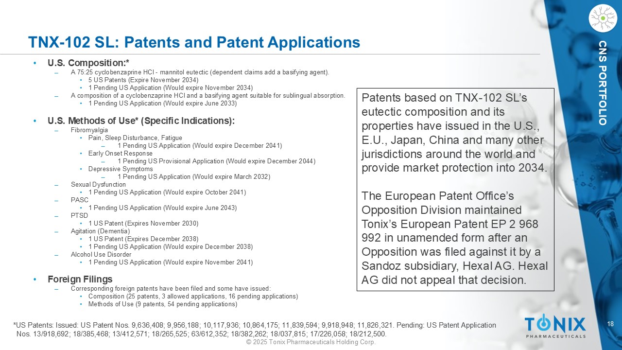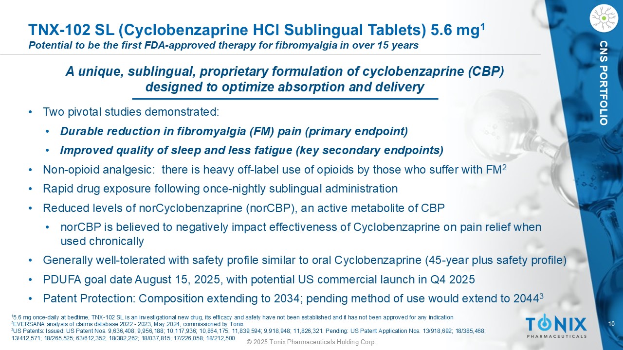 10 © 2025 Tonix Pharmaceuticals Holding Corp. CNS PORTFOLIO TNX - 102 SL (Cyclobenzaprine HCl Sublingual Tablets) 5.6 mg 1 Potential to be the first FDA - approved therapy for fibromyalgia in over 15 years A unique, sublingual, proprietary formulation of cyclobenzaprine (CBP) designed to optimize absorption and delivery • Two pivotal studies demonstrated: • Durable reduction in fibromyalgia (FM) pain (primary endpoint) • Improved quality of sleep and less fatigue (key secondary endpoints) • Non - opioid analgesic: there is heavy off - label use of opioids by those who suffer with FM 2 • Rapid drug exposure following once - nightly sublingual administration • Reduc ed levels of norCyclobenzaprine (norCBP), an active metabolite of CBP • norCBP is believed to negatively impact effectiveness of Cyclobenzaprine on pain relief when used chronically • Generally well - tolerated with safety profile similar to oral Cyclobenzaprine (45 - year plus safety profile) • PDUFA goal date August 15, 2025, with potential US commercial launch in Q4 2025 • Patent Protection: Composition extending to 2034; pending method of use would extend to 2044 3 1 5.6 mg once - daily at bedtime, TNX - 102 SL is an investigational new drug, its efficacy and safety have not been established and i t has not been approved for any indication 2 EVERSANA analysis of claims database 2022 - 2023, May 2024; commissioned by Tonix 3 US Patents: Issued: US Patent Nos. 9,636,408; 9,956,188; 10,117,936; 10,864,175; 11,839,594; 9,918,948; 11,826,321. Pending: US Patent Application Nos. 13/918,692; 18/385,468; 13/412,571; 18/265,525; 63/612,352; 18/382,262; 18/037,815; 17/226,058; 18/212,500
