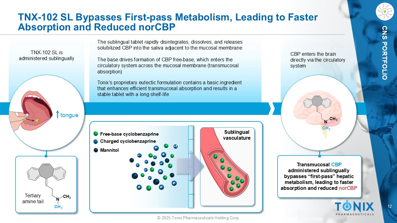 11 © 2025 Tonix Pharmaceuticals Holding Corp. CNS PORTFOLIO CBP and norCBP enter the brain Oral CBP Undergoes First - pass Metabolism, Leading to Increased Concentrations of norCBP Relative to CBP Over Time tongue CBP administered as a swallowed oral dose CBP undergoes “first - pass” hepatic metabolism and is ~50% converted to the persistent active metabolite norCyclobenzaprine (norCBP) CH 3 N CH 3 CH 3 N CH 3 CH 3 CH 3 N H CH 3 N CH 3 CH 3 N H A swallowed oral dose leads to increased concentrations of norCBP relative to CBP over time < CBP norCBP Secondary amine tail Tertiary amine tail