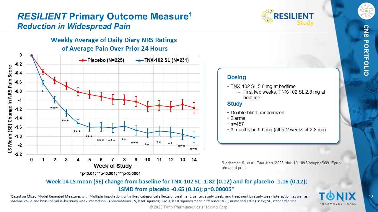 12 © 2025 Tonix Pharmaceuticals Holding Corp. CNS PORTFOLIO CBP enters the brain directly via the circulatory system TNX - 102 SL Bypasses First - pass Metabolism, Leading to Faster Absorption and Reduced norCBP tongue TNX - 102 SL is administered sublingually The sublingual tablet rapidly disintegrates, dissolves, and releases solubilized CBP into the saliva adjacent to the mucosal membrane The base drives formation of CBP free - base, which enters the circulatory system across the mucosal membrane (transmucosal absorption) Transmucosal CBP administered sublingually bypasses “first - pass” hepatic metabolism, leading to faster absorption and reduced norCBP + + + + + + + + +f + + + + + Mannitol Free - base cyclobenzaprine Charged cyclobenzaprine Tonix’s proprietary eutectic formulation contains a basic ingredient that enhances efficient transmucosal absorption and results in a stable tablet with a long shelf - life Sublingual vasculature Tertiary amine tail CH 3 N CH 3 CH 3 N CH 3