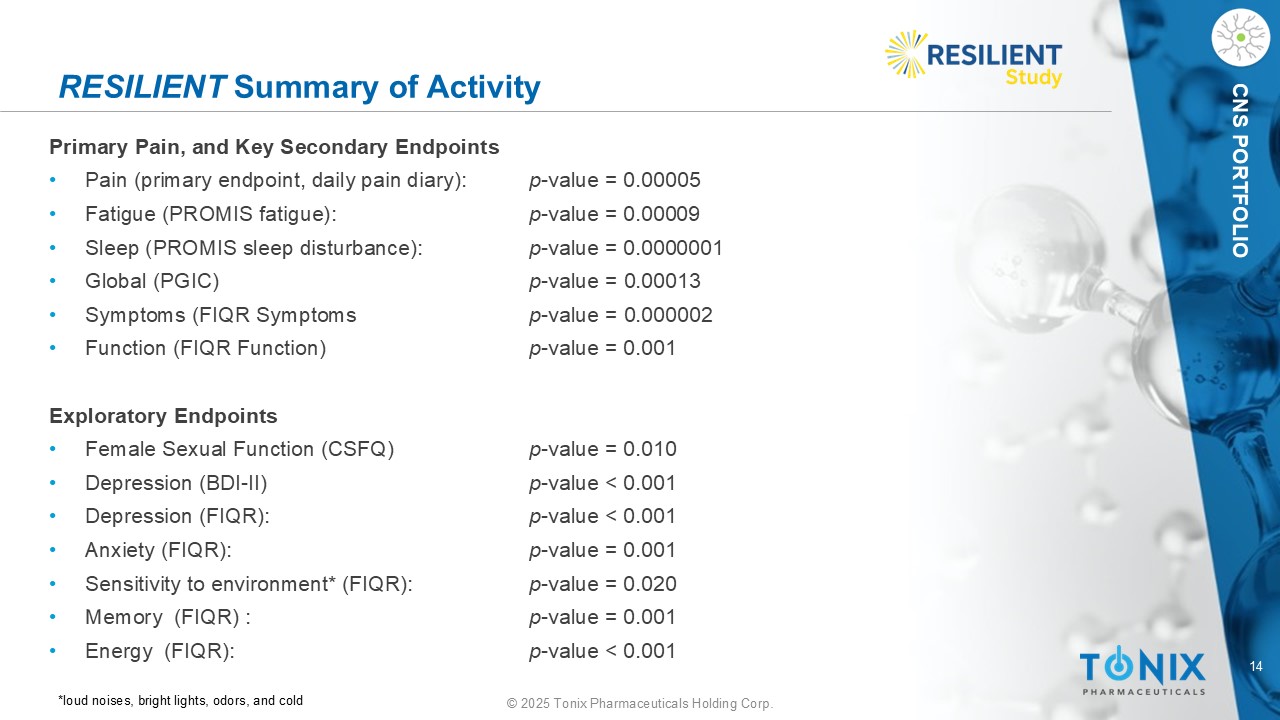 13 © 2025 Tonix Pharmaceuticals Holding Corp. CNS PORTFOLIO RESILIENT Primary Outcome Measure 1 Reduction in Widespread Pain -2.2 -2 -1.8 -1.6 -1.4 -1.2 -1 -0.8 -0.6 -0.4 -0.2 0 0 1 2 3 4 5 6 7 8 9 10 11 12 13 14 LS Mean (SE) Change in NRS Pain Score Week of Study Placebo (N=225) TNX-102 SL (N=231) * *** *** ** ** ** *** *** *** *** *** *** *** ** *p<0.01; **p<0.001; ***p<0.0001 Week 14 LS mean (SE) change from baseline for TNX - 102 SL - 1.82 (0.12) and for placebo - 1.16 (0.12); LSMD from placebo - 0.65 (0.16); p=0.00005* * Based on Mixed Model Repeated Measures with Multiple Imputation, with fixed categorical effects of treatment, center, study w eek , and treatment by study week interaction, as well as baseline value and baseline value - by - study week interaction. Abbreviations: LS, least squares; LSMD, least squares mean differe nce; NRS, numerical rating scale; SE, standard error Weekly Average of Daily Diary NRS Ratings of Average Pain Over Prior 24 Hours Dosing • TNX - 102 SL 5.6 mg at bedtime ‒ First two weeks, TNX - 102 SL 2.8 mg at bedtime Study • Double - blind, randomized • 2 arms • n=457 • 3 months on 5.6 mg (after 2 week s at 2.8 mg) 1 Lederman S, et al. Pain Med . 2025 : doi : 10.1093/pm/pnaf089. Epub ahead of print.