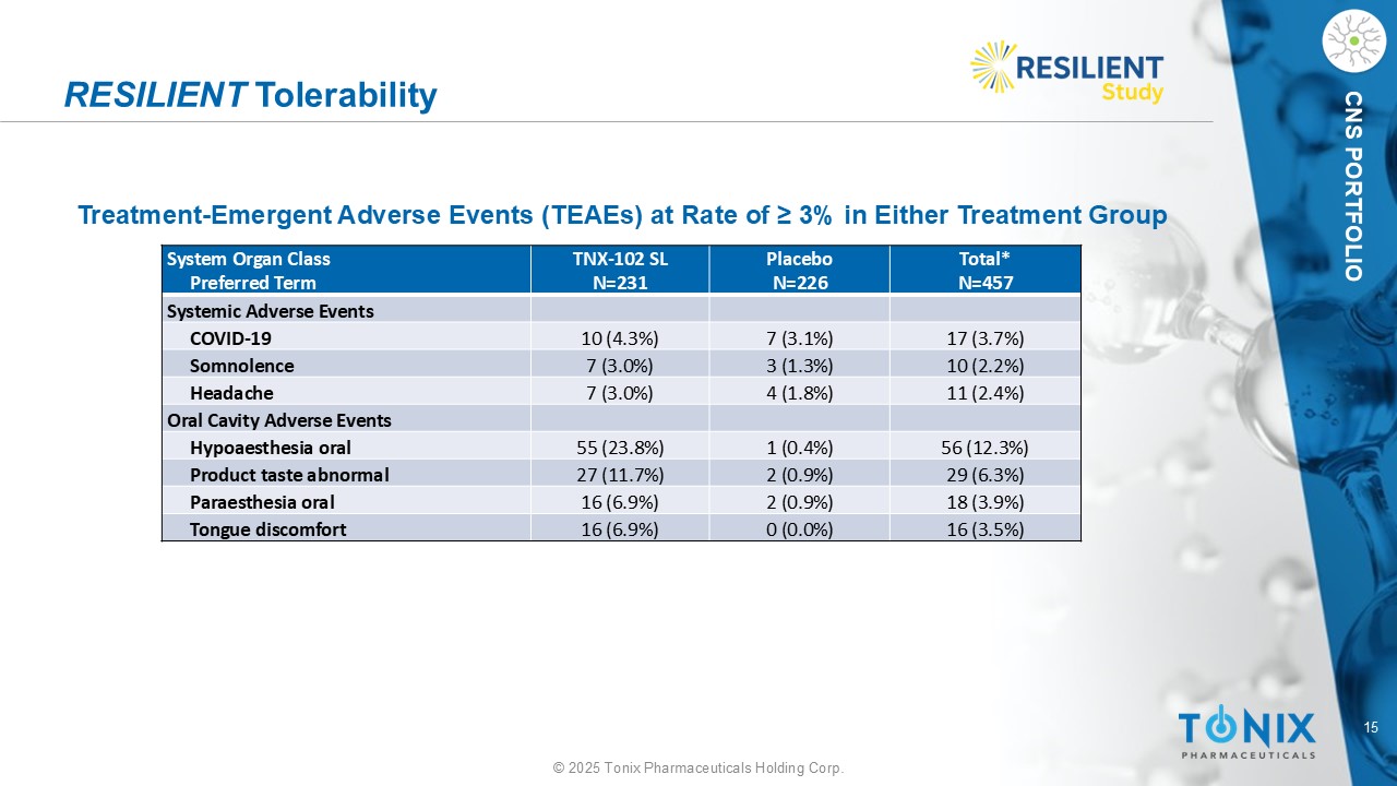 14 © 2025 Tonix Pharmaceuticals Holding Corp. CNS PORTFOLIO RESILIENT Summary of Activity Primary Pain, and Key Secondary Endpoints • Pain (primary endpoint, daily pain diary): p - value = 0.00005 • Fatigue (PROMIS fatigue): p - value = 0.00009 • Sleep (PROMIS sleep disturbance): p - value = 0.0000001 • Global (PGIC) p - value = 0.00013 • Symptoms (FIQR Symptoms p - value = 0.000002 • Function (FIQR Function) p - value = 0.001 Exploratory Endpoints • Female Sexual Function (CSFQ) p - value = 0.010 • Depression (BDI - II) p - value < 0.001 • Depression (FIQR): p - value < 0.001 • Anxiety (FIQR): p - value = 0.001 • Sensitivity to environment* (FIQR): p - value = 0.020 • Memory (FIQR) : p - value = 0.001 • Energy (FIQR): p - value < 0.001 *loud noises, bright lights, odors, and cold