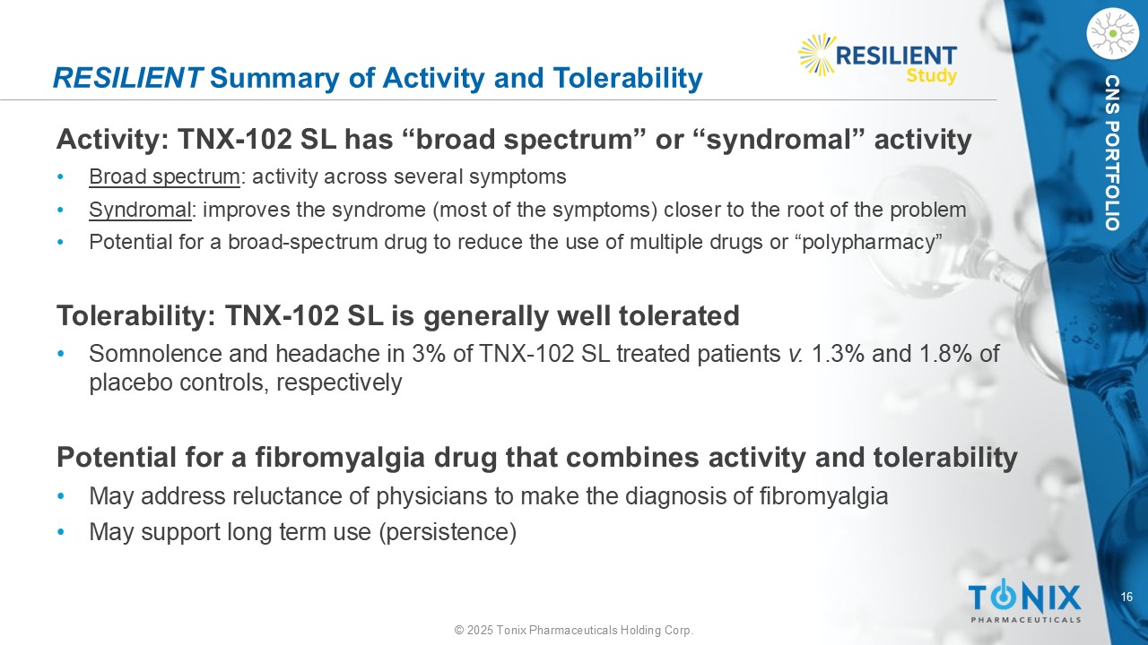 15 © 2025 Tonix Pharmaceuticals Holding Corp. CNS PORTFOLIO RESILIENT Tolerability Total* N=457 Placebo N=226 TNX - 102 SL N=231 System Organ Class Preferred Term Systemic Adverse Events 17 (3.7%) 7 (3.1%) 10 (4.3%) COVID - 19 10 (2.2%) 3 (1.3%) 7 (3.0%) Somnolence 11 (2.4%) 4 (1.8%) 7 (3.0%) Headache Oral Cavity Adverse Events 56 (12.3%) 1 (0.4%) 55 (23.8%) Hypoaesthesia oral 29 (6.3%) 2 (0.9%) 27 (11.7%) Product taste abnormal 18 (3.9%) 2 (0.9%) 16 (6.9%) Paraesthesia oral 16 (3.5%) 0 (0.0%) 16 (6.9%) Tongue discomfort Treatment - Emergent Adverse Events (TEAEs) at Rate of ≥ 3% in Either Treatment Group