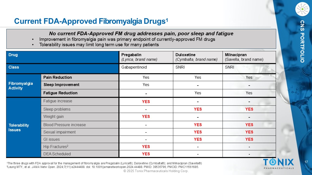 16 © 2025 Tonix Pharmaceuticals Holding Corp. CNS PORTFOLIO RESILIENT Summary of Activity and Tolerability Activity: TNX - 102 SL has “broad spectrum” or “syndromal” activity • Broad spectrum : activity across several symptoms • Syndromal : improves the syndrome (most of the symptoms) closer to the root of the problem • Potential for a broad - spectrum drug to reduce the use of multiple drugs or “polypharmacy” Tolerability: TNX - 102 SL is generally well tolerated • Somnolence and headache in 3% of TNX - 102 SL treated patients v. 1.3% and 1.8% of placebo controls, respectively Potential for a fibromyalgia drug that combines activity and tolerability • May address reluctance of physicians to make the diagnosis of fibromyalgia • May support long term use (persistence)