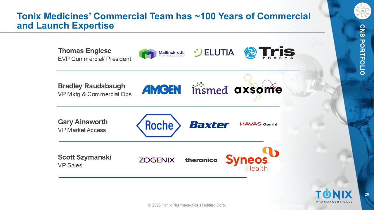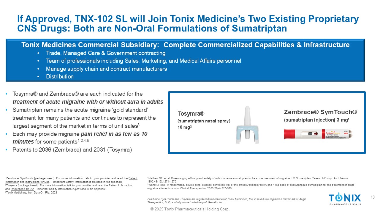 © 2025 Tonix Pharmaceuticals Holding Corp. If Approved, TNX - 102 SL will Join Tonix Medicine’s Two Existing Proprietary CNS Drugs: Both are Non - Oral Formulations of Sumatriptan • Tosymra ® and Zembrace ® are each indicated for the tr eatment of acute migraine with or without aura in adults • Sumatriptan remains the acute migraine ‘gold standard’ treatment for many patients and continues to represent the largest segment of the market in terms of unit sales 3 • Each may provide migraine pain relief in as few as 10 minutes for some patients 1,2,4,5 • Patents to 2036 (Zembrace) and 2031 (Tosymra) 1 Zembrace SymTouch [package insert] . For more information, talk to your provider and read the Patient Information and Instructions for Use . – Important Safety Information is provided in the appendix 2 Tosymra [package insert ]. For more information, talk to your provider and read the Patient Information and Instructions for use – Important Safety Information is provided in the appendix 3 Tonix Medicines, Inc.; Data On File, 2023 Zembrace® SymTouch® (sumatriptan injection) 3 mg 1 Tosymra® (sumatriptan nasal spray) 10 mg 2 Tonix Medicines Commercial Subsidiary: Complete Commercialized Capabilities & Infrastructure • Trade, Managed Care & Government contracting • Team of professionals including Sales, Marketing, and Medical Affairs personnel • Manage supply chain and contract manufacturers • Distribution 4 Mathew NT, et al. Dose ranging efficacy and safety of subcutaneous sumatriptan in the acute treatment of migraine. US Sumatri pta n Research Group. Arch Neurol. 1992;49(12):1271 - 1276. 5 Wendt J, et al. A randomized, double - blind, placebo - controlled trial of the efficacy and tolerability of a 4 - mg dose of subcutan eous sumatriptan for the treatment of acute migraine attacks in adults. Clinical Therapeutics. 2006;28(4):517 - 526. Zembrace SymTouch and Tosymra are registered trademarks of Tonix Medicines, Inc. Intravail is a registered trademark of Aegis Therapeutics, LLC, a wholly owned subsidiary of Neurelis, Inc. 19