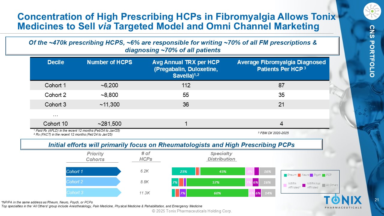 20 © 2025 Tonix Pharmaceuticals Holding Corp. CNS PORTFOLIO Tonix Medicines’ Commercial Team has ~100 Years of Commercial and Launch Expertise Thomas Englese EVP Commercial/ President Scott Szymanski VP Sales Bradley Raudabaugh VP Mktg & Commercial Ops Gary Ainsworth VP Market Access