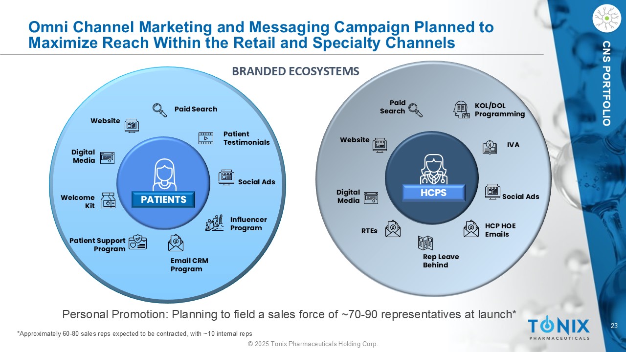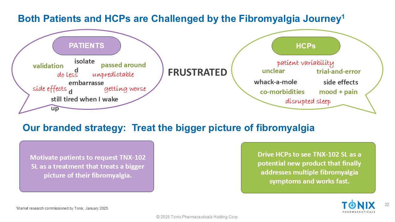 © 2025 Tonix Pharmaceuticals Holding Corp. Both Patients and HCPs are Challenged by the Fibromyalgia Journey 1 FRUSTRATED Motivate patients to request TNX - 102 SL as a treatment that treats a bigger picture of their fibromyalgia. Drive HCPs to see TNX - 102 SL as a potential new product that finally addresses multiple fibromyalgia symptoms and works fast. Our branded strategy: Treat the bigger picture of fibromyalgia PATIENTS validation isolated embarrassed do less unpredictable side effects getting worse passed around HCPs unclear trial - and - error whack - a - mole side effects mood + pain patient variability co - morbidities 1 Market research commissioned by Tonix, January 2025 still tired when I wake up disrupted sleep 22