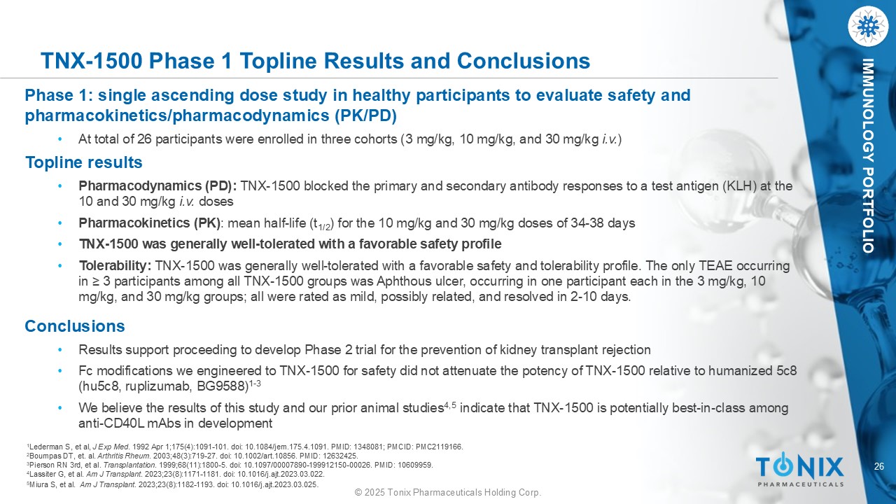 26 © 2025 Tonix Pharmaceuticals Holding Corp. IMMUNOLOGY PORTFOLIO TNX - 1500 Phase 1 Topline Results and Conclusions Phase 1: single ascending dose study in healthy participants to evaluate safety and pharmacokinetics/pharmacodynamics (PK/PD) • At total of 26 participants were enrolled in three cohorts ( 3 mg/kg, 10 mg/kg, and 30 mg/kg i.v. ) Topline results • Pharmacodynamics (PD): TNX - 1500 blocked the primary and secondary antibody responses to a test antigen (KLH) at the 10 and 30 mg/kg i.v. doses • Pharmacokinetics (PK) : mean half - life (t 1/2 ) for the 10 mg/kg and 30 mg/kg doses of 34 - 38 days • TNX - 1500 was generally well - tolerated with a favorable safety profile • Tolerability: TNX - 1500 was generally well - tolerated with a favorable safety and tolerability profile. The only TEAE occurring in ≥ 3 participants among all TNX - 1500 groups was Aphthous ulcer, occurring in one participant each in the 3 mg/kg, 10 mg/kg, and 30 mg/kg groups; all were rated as mild, possibly related, and resolved in 2 - 10 days. Conclusions • Results support proceeding to develop Phase 2 trial for the prevention of kidney transplant rejection • Fc modifications we engineered to TNX - 1500 for safety did not attenuate the potency of TNX - 1500 relative to humanized 5c8 (hu5c8, ruplizumab, BG9588) 1 - 3 • We believe the results of this study and our prior animal studies 4,5 indicate that TNX - 1500 is potentially best - in - class among anti - CD40L mAbs in development 1 Lederman S, et al, J Exp Med . 1992 Apr 1;175(4):1091 - 101. doi: 10.1084/jem.175.4.1091. PMID: 1348081; PMCID: PMC2119166. 2 Boumpas DT, et. al. Arthritis Rheum . 2003;48(3):719 - 27. doi: 10.1002/art.10856. PMID: 12632425. 3 Pierson RN 3rd, et al. Transplantation . 1999;68(11):1800 - 5. doi: 10.1097/00007890 - 199912150 - 00026. PMID: 10609959. 4 Lassiter G, et al. Am J Transplant . 2023;23(8):1171 - 1181. doi: 10.1016/j.ajt.2023.03.022. 5 Miura S, et al. Am J Transplant . 2023;23(8):1182 - 1193. doi: 10.1016/j.ajt.2023.03.025 .