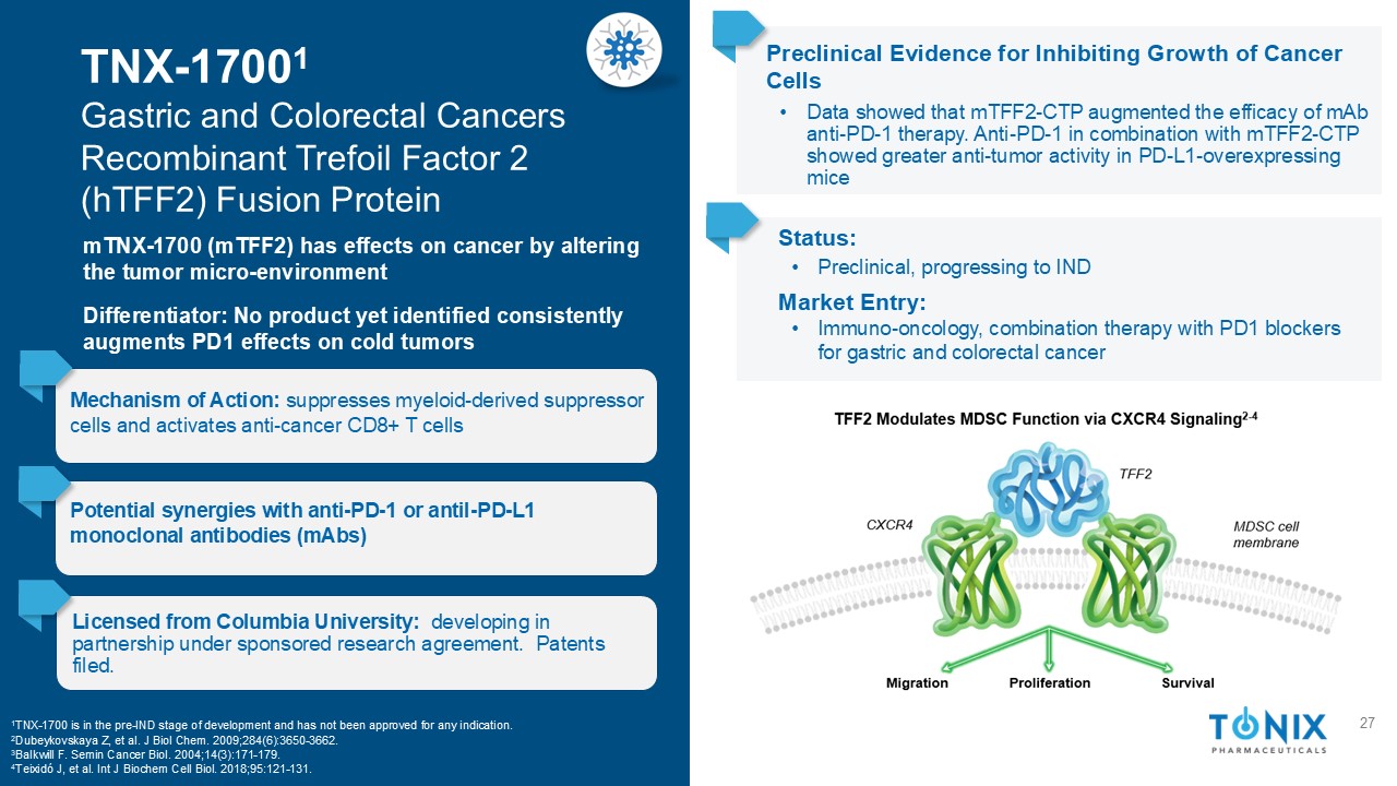 TNX - 1700 1 Gastric and Colorectal Cancers Recombinant Trefoil Factor 2 (hTFF2) Fusion Protein Mechanism of Action : suppresses myeloid - derived suppressor cells and activates anti - cancer CD8+ T cells Potential synergies with anti - PD - 1 or antil - PD - L1 monoclonal antibodies (mAbs) Licensed from Columbia University: developing in partnership under sponsored research agreement. Patents filed. Preclinical Evidence for Inhibiting Growth of Cancer Cells • Data showed that mTFF2 - CTP augmented the efficacy of mAb anti - PD - 1 therapy. Anti - PD - 1 in combination with mTFF2 - CTP showed greater anti - tumor activity in PD - L1 - overexpressing mice mTNX - 1700 (mTFF2) has effects on cancer by altering the tumor micro - environment Differentiator: No product yet identified consistently augments PD1 effects on cold tumors 1 TNX - 1700 is in the pre - IND stage of development and has not been approved for any indication. 2 Dubeykovskaya Z, et al. J Biol Chem. 2009;284(6):3650 - 3662. 3 Balkwill F. Semin Cancer Biol. 2004;14(3):171 - 179. 4 Teixidó J, et al. Int J Biochem Cell Biol. 2018;95:121 - 131. Status: • Preclinical, progressing to IND Market Entry: • Immuno - oncology, combination therapy with PD1 blockers for gastric and colorectal cancer 27