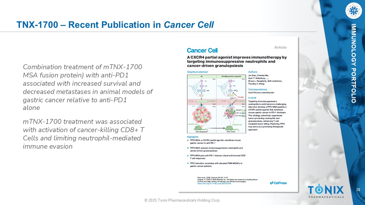28 © 2025 Tonix Pharmaceuticals Holding Corp. IMMUNOLOGY PORTFOLIO TNX - 1700 – Recent Publication in Cancer Cell Combination treatment of mTNX - 1700 (mTFF2 - MSA fusion protein) with anti - PD1 antibody was associated with increased survival and decreased metastases in animal models of gastric cancer relative to anti - PD1 treatment alone mTNX - 1700 treatment was associated with activation of cancer - killing CD8+ T Cells and limiting neutrophil - mediated immune evasion
