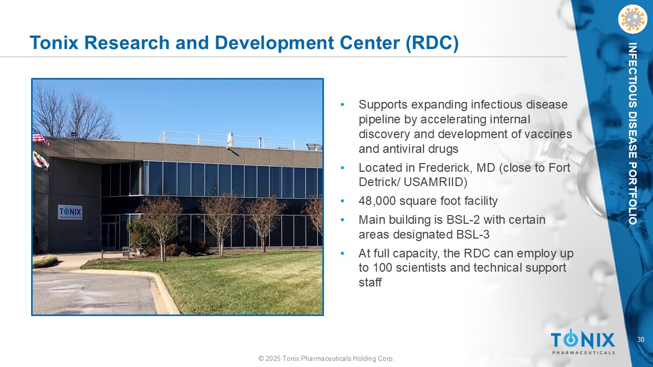 30 © 2025 Tonix Pharmaceuticals Holding Corp. INFECTIOUS DISEASE PORTFOLIO Tonix Research and Development Center (RDC) • Supports expanding infectious disease pipeline by accelerating internal discovery and development of vaccines and antiviral drugs • Located in Frederick, MD (close to Fort Detrick/ USAMRIID) • 48,000 square foot facility • Main building is BSL - 2 with certain areas designated BSL - 3 • At full capacity, the RDC can employ up to 100 scientists and technical support staff