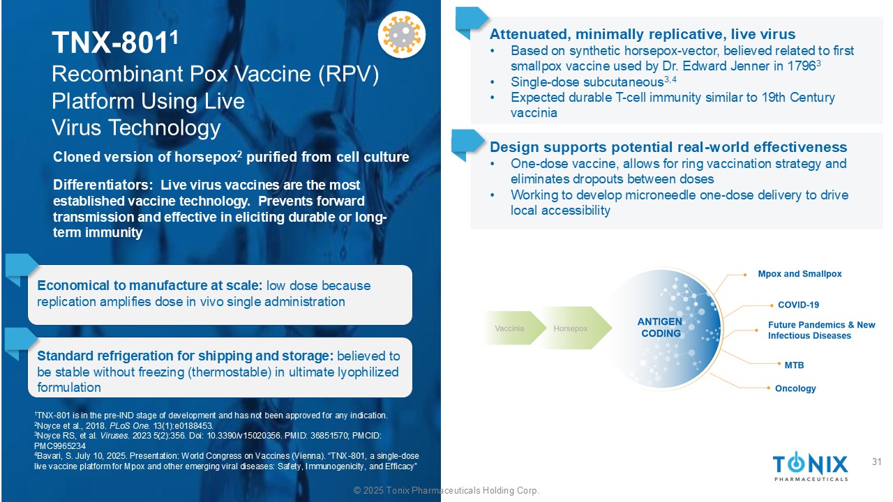 © 2025 Tonix Pharmaceuticals Holding Corp. TNX - 801 1 Recombinant Pox Vaccine (RPV) Platform Using Live Virus Technology Economical to manufacture at scale: l ow dose because replication amplifies dose in vivo single administration Standard refrigeration for shipping and storage: believed to be stable without freezing (thermostable) in ultimate lyophilized formulation Attenuated, minimally replicative, live virus • Based on synthetic horsepox - vector, believed related to first smallpox vaccine used by Dr. Edward Jenner in 1796 3 • Single - dose subcutaneous 3,4 • Expected durable T - cell immunity similar to 19th Century vaccinia Cloned version of horsepox 2 purified from cell culture Differentiators: Live virus vaccines are the most established vaccine technology. Prevents forward transmission and effective in eliciting durable or long - term immunity 1 TNX - 801 is in the pre - IND stage of development and has not been approved for any indication. 2 Noyce et al., 2018. PLoS One . 13(1):e0188453 . 3 Noyce RS, et al. Viruses . 2023 5(2):356. Doi: 10.3390/v15020356. PMID: 36851570; PMCID: PMC9965234 4 Bavari, S. July 10, 2025. Presentation: World Congress on Vaccines (Vienna). “TNX - 801, a single - dose live vaccine platform for Mpox and other emerging viral diseases: Safety, Immunogenicity, and Efficacy” Design supports potential real - world effectiveness • One - dose vaccine, allows for ring vaccination strategy and eliminates dropouts between doses • Working to develop microneedle one - dose delivery to drive local accessibility 31