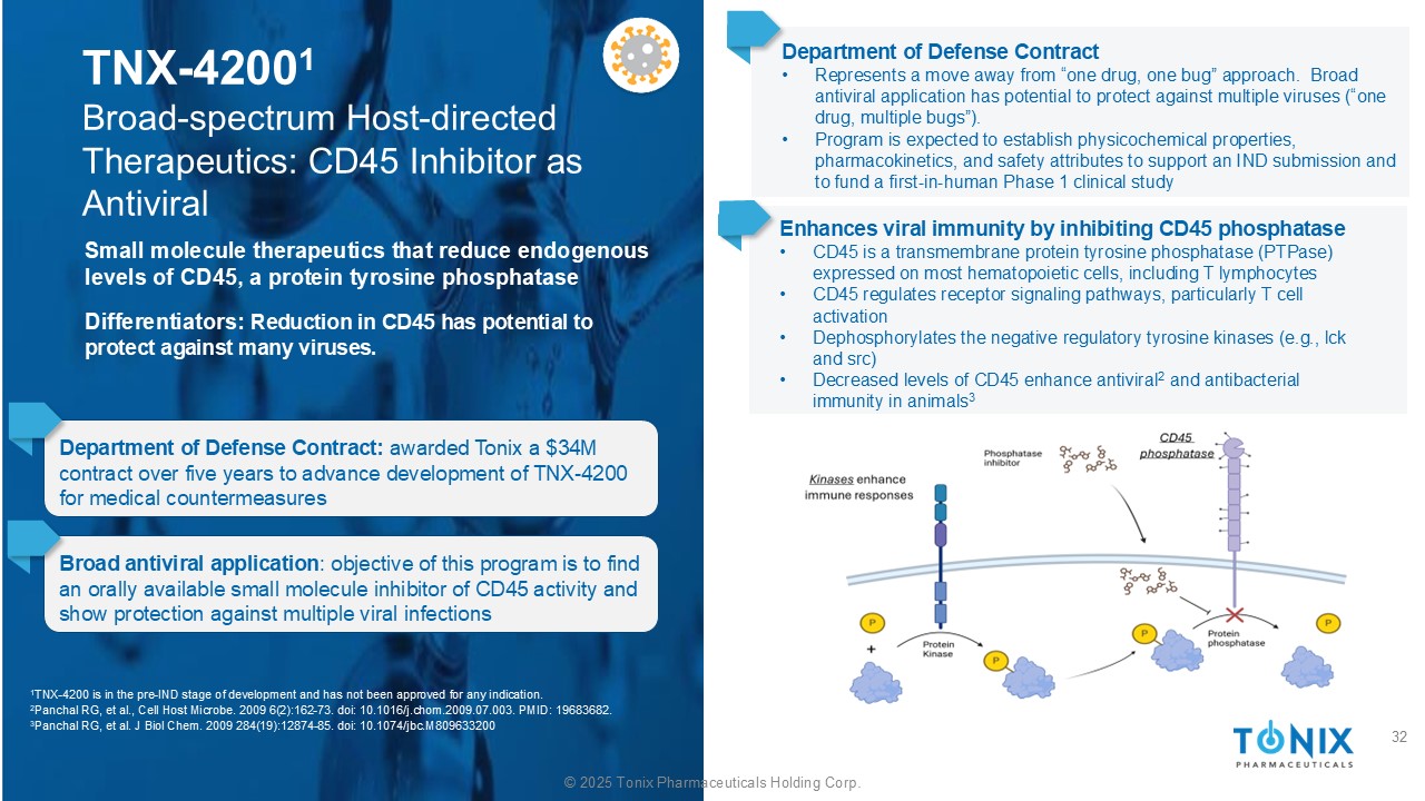 © 2025 Tonix Pharmaceuticals Holding Corp. TNX - 4200 1 Broad - spectrum Host - directed Therapeutics: CD45 Inhibitor as Antiviral Department of Defense Contract : awarded Tonix a $34M contract over five years to advance development of TNX - 4200 for medical countermeasures Broad antiviral application : objective of this program is to find an orally available small molecule inhibitor of CD45 activity and show protection against multiple viral infections Department of Defense Contract • Represents a move away from “one drug, one bug” approach. Broad antiviral application has potential to protect against multiple viruses (“one drug, multiple bugs”). • Program is expected to establish physicochemical properties, pharmacokinetics, and safety attributes to support an IND submission and to fund a first - in - human Phase 1 clinical study Small molecule therapeutics that reduce endogenous levels of CD45, a protein tyrosine phosphatase Differentiators: Reduction in CD45 has potential to protect against many viruses. 1 TNX - 4200 is in the pre - IND stage of development and has not been approved for any indication. 2 Panchal RG, et al., Cell Host Microbe. 2009 6(2):162 - 73. doi: 10.1016/j.chom.2009.07.003. PMID: 19683682. 3 Panchal RG, et al. J Biol Chem. 2009 284(19):12874 - 85. doi: 10.1074/jbc.M809633200 Enhances v iral immunity by inhibiting CD45 phosphatase • CD45 is a transmembrane protein tyrosine phosphatase (PTPase) expressed on most hematopoietic cells, including T lymphocytes • CD45 regulates receptor signaling pathways, particularly T cell activation • D ephosphorylates the negative regulatory tyrosine kinases (e.g., lck and src) • Decreased levels of CD45 enhance antiviral 2 and antibacterial immunity in animals 3 32