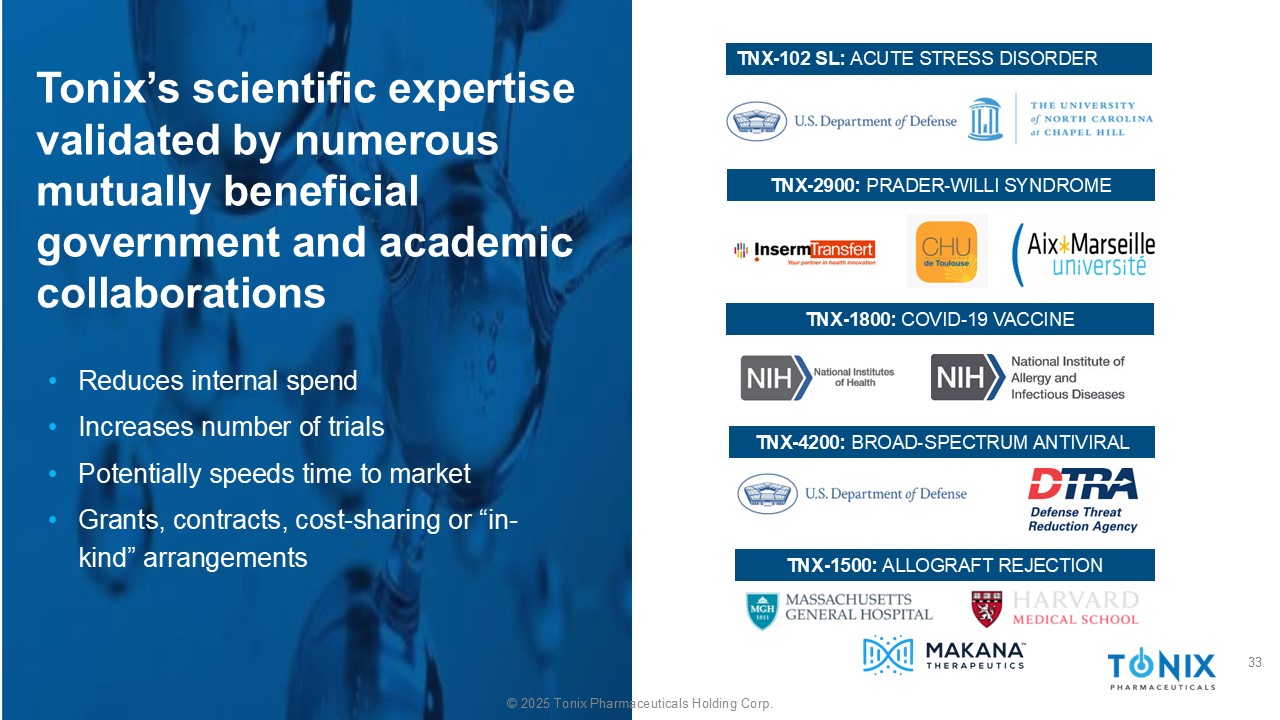 © 2025 Tonix Pharmaceuticals Holding Corp. Tonix’s scientific expertise validated by numerous mutually beneficial government and academic collaborations • Reduces internal spend • Increases number of trials • Potentially speeds time to market • Grants, contracts, cost - sharing or “in - kind” arrangements TNX - 1500: ALLOGRAFT REJECTION TNX - 1800: COVID - 19 VACCINE TNX - 2900: PRADER - WILLI SYNDROME TNX - 102 SL: ACUTE STRESS DISORDER TNX - 4200: BROAD - SPECTRUM ANTIVIRAL 33