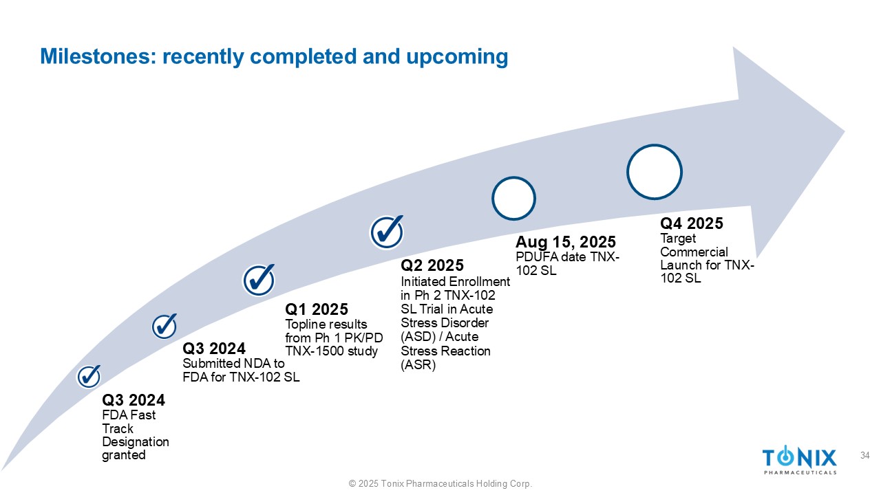 © 2025 Tonix Pharmaceuticals Holding Corp. Milestones: recently completed and upcoming Q3 2024 FDA Fast Track Designation granted Q3 2024 Submitted NDA to FDA for TNX - 102 SL Q1 2025 Topline results from Ph 1 PK/PD TNX - 1500 study Aug 15, 2025 PDUFA date TNX - 102 SL Q4 2025 Target Commercial Launch for TNX - 102 SL Q2 2025 Initiated Enrollment in Ph 2 TNX - 102 SL Trial in Acute Stress Disorder (ASD) / Acute Stress Reaction (ASR) 34