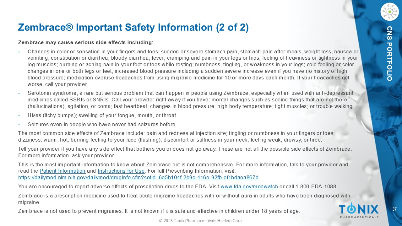 36 © 2025 Tonix Pharmaceuticals Holding Corp. CNS PORTFOLIO Zembrace® Important Safety Information (1 of 2) Zembrace SymTouch (Zembrace) can cause serious side effects, including heart attack and other heart problems, which may lead to death. Stop use and get emergency help if you have any signs of a heart attack: D iscomfort in the center of your chest that lasts for more than a few minutes or goes away and comes back; severe tightness, pain, pressure, or heaviness in your chest, throat, neck, or jaw; pain or discomfort in your arms, back, neck, jaw or stomach ; shortness of breath with or without chest discomfort ; breaking out in a cold sweat ; nausea or vomiting ; feeling lightheaded Zembrace is not for people with risk factors for heart disease (high blood pressure or cholesterol, smoking, overweight, diabetes, family history of heart disease) unless a heart exam shows no problem. Do not use Zembrace if you have: H istory of heart problems ; narrowing of blood vessels to your legs, arms, stomach, or kidney (peripheral vascular disease) ; uncontrolled high blood pressure ; hemiplegic or basilar migraines. If you are not sure if you have these, ask your provider. H ad a stroke, transient ischemic attacks (TIAs), or problems with blood circulation ; severe liver problems ; taken any of the following medicines in the last 24 hours: almotriptan, eletriptan, frovatriptan, naratriptan, rizatriptan, ergotamines, dihydroergotamine ; are taking certain antidepressants, known as monoamine oxidase (MAO) - A inhibitors or it has been 2 weeks or less since you stopped taking a MAO - A inhibitor. Ask your provider for a list of these medicines if you are not sure. A n allergy to sumatriptan or any of the components of Zembrace Tell your provider about all of your medical conditions and medicines you take, including vitamins and supplements. Zembrace can cause dizziness, weakness, or drowsiness. If so, do not drive a car, use machinery, or do anything where you need to be alert.