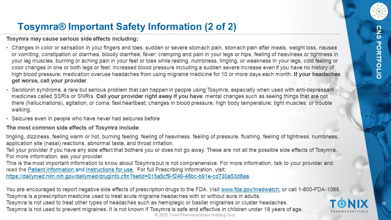 38 © 2025 Tonix Pharmaceuticals Holding Corp. CNS PORTFOLIO Tosymra® Important Safety Information (1 of 2) Tosymra® can cause serious side effects, including heart attack and other heart problems, which may lead to death. Stop Tosymra and get emergency medical help if you have any signs of heart attack: • D iscomfort in the center of your chest that lasts for more than a few minutes or goes away and comes back ; severe tightness, pain, pressure, or heaviness in your chest, throat, neck, or jaw ; pain or discomfort in your arms, back, neck, jaw, or stomach ; shortness of breath with or without chest discomfort; breaking out in a cold sweat ; nausea or vomiting ; feeling lightheaded Tosymra is not for people with risk factors for heart disease (high blood pressure or cholesterol, smoking, overweight, diabetes, family history of heart disease) unless a heart exam is done and shows no problem. Do not use Tosymra if you have: • H istory of heart problems ; narrowing of blood vessels to your legs, arms, stomach, or kidney (peripheral vascular disease) ; uncontrolled high blood pressure ; severe liver problems ; hemiplegic or basilar migraines. If you are not sure if you have these, ask your healthcare provider. • H ad a stroke, transient ischemic attacks (TIAs), or problems with blood circulation ; taken any of the following medicines in the last 24 hours: almotriptan, eletriptan, frovatriptan, naratriptan, rizatriptan, ergotamines, or dihydroergotamine. Ask your provider if you are not sure if your medicine is listed above • are taking certain antidepressants, known as monoamine oxidase (MAO) - A inhibitors or it has been 2 weeks or less since you stopped taking a MAO - A inhibitor . A sk your provider for a list of these medicines if you are not sure • A n allergy to sumatriptan or any ingredient in Tosymra Tell your provider about all of your medical conditions and medicines you take, including vitamins and supplements. Tosymra can cause dizziness, weakness, or drowsiness. If so, do not drive a car, use machinery, or do anything where you need to be alert.