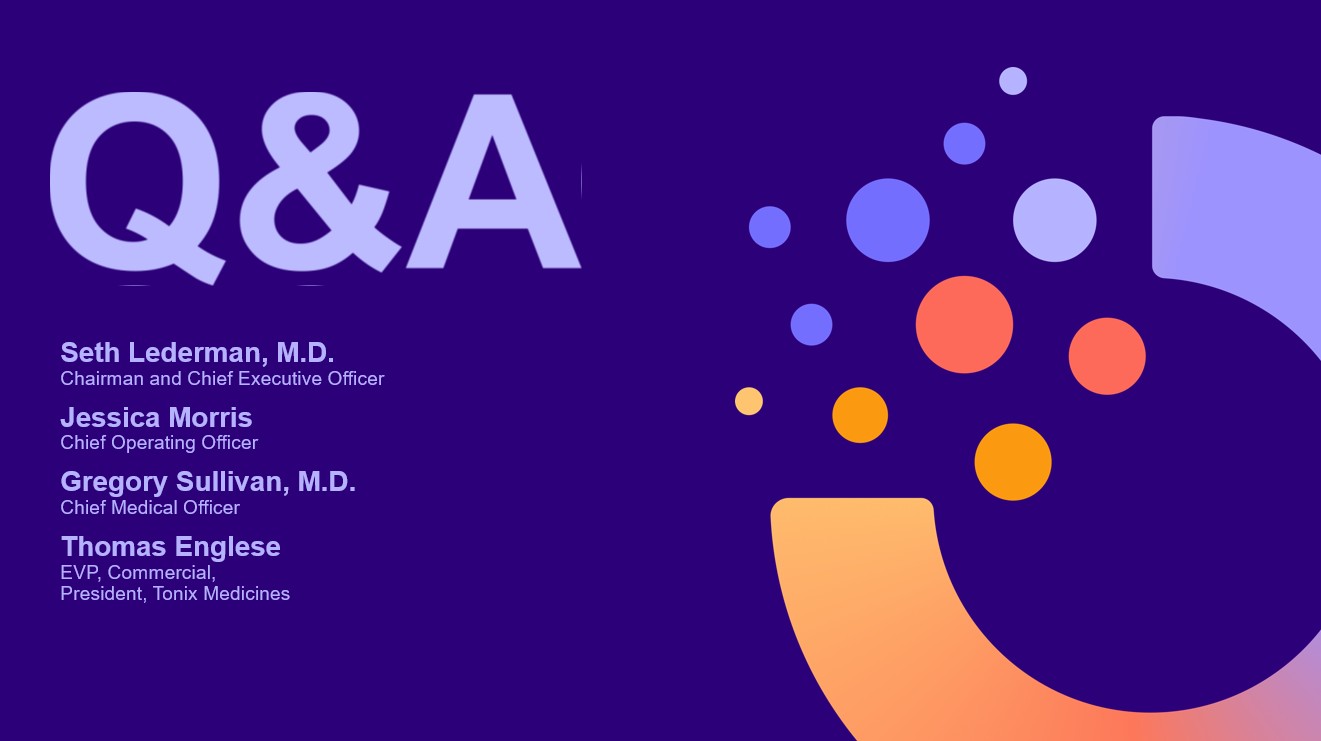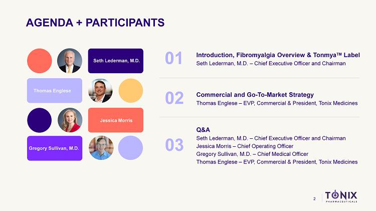 Seth Lederman, M.D. Chairman and Chief Executive Officer Jessica Morris Chief Operating Officer Gregory Sullivan, M.D. Chief Medical Officer Thomas Englese EVP, Commercial , President, Tonix Medicines