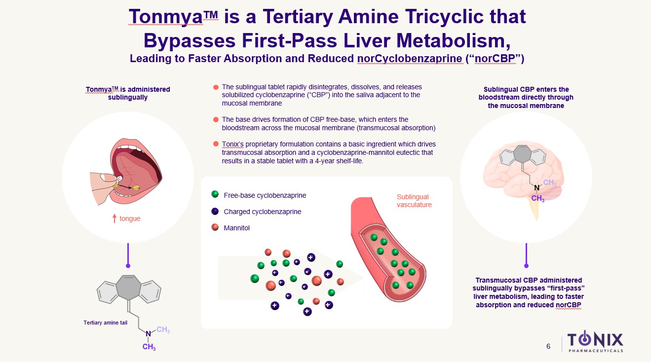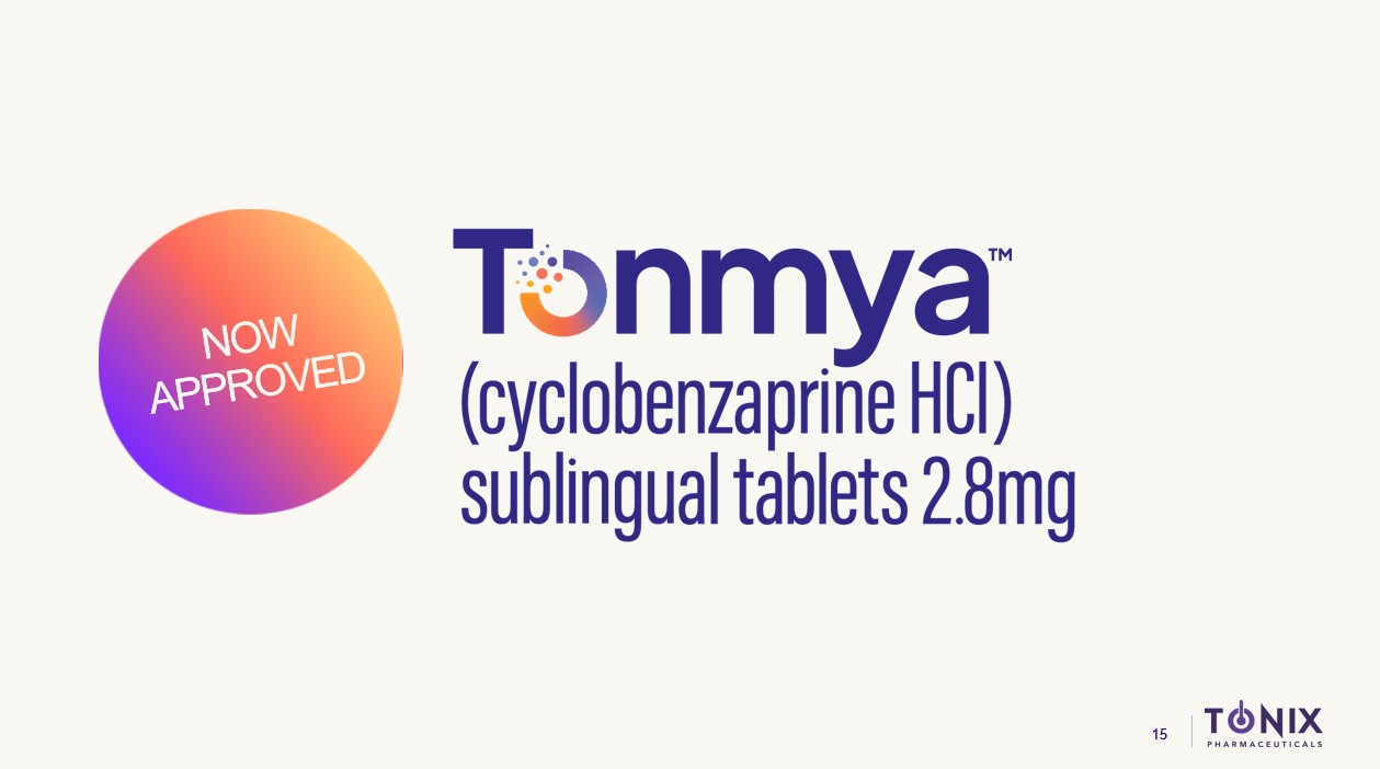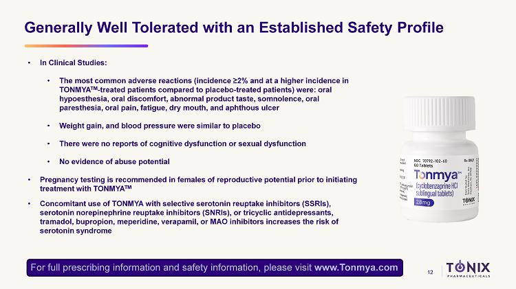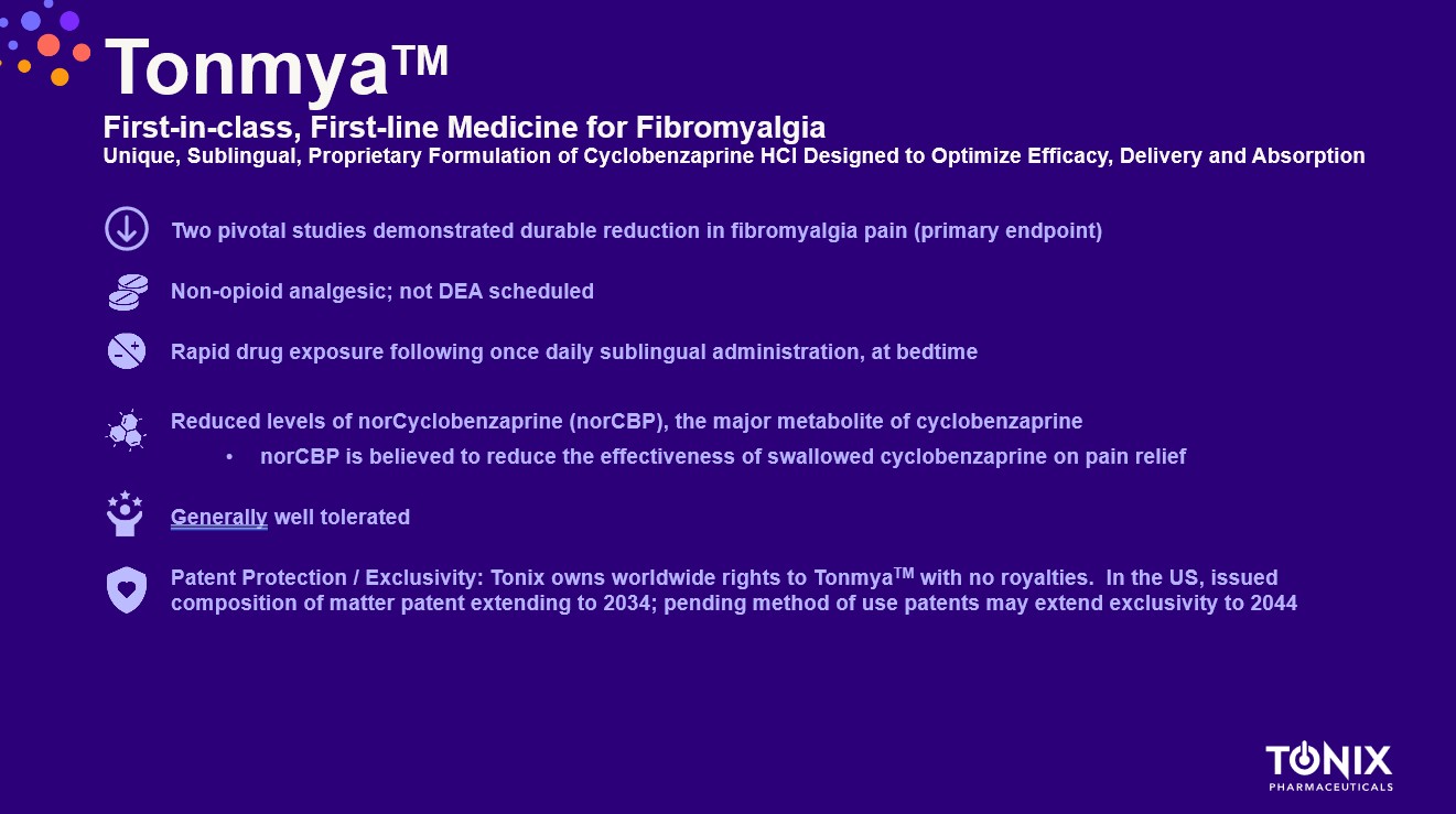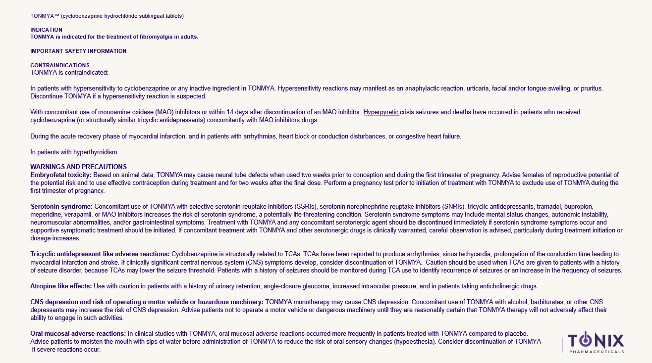 IMPORTANT SAFETY INFORMATION (CONT’D) ADVERSE REACTIONS The most common adverse reactions (incidence ≥2% and at a higher incidence in TONMYA - treated patients compared to placebo - treate d patients) were oral hypoesthesia, oral discomfort, abnormal product taste, somnolence, oral paresthesia, oral pain, fatigue, dry mouth, and aphthous ulcer. DRUG INTERACTIONS MAO inhibitors: Life - threatening interactions may occur. Other serotonergic drugs: Serotonin syndrome has been reported. CNS depressants: CNS depressant effects of alcohol, barbiturates, and other CNS depressants may be enhanced. Tramadol: Seizure risk may be enhanced. Guanethidine or other similar acting drugs: The antihypertensive action of these drugs may be blocked. USE IN SPECIFIC POPULATIONS Pregnancy: Based on animal data, TONMYA may cause fetal harm when administered to a pregnant woman. The limited amount of available obse rva tional data on oral cyclobenzaprine use in pregnancy is of insufficient quality to inform a TONMYA - associated risk of major birth defects, miscarriage, or adverse maternal or fetal outcom es. Advise pregnant women about the potential risk to the fetus with maternal exposure to TONMYA and to avoid use of TONMYA two weeks prior to conception and through the first trimester of pregnancy. Report pregnanc ies to the Tonix Medicines, Inc., adverse - event reporting line at 1 - 888 - 869 - 7633 (1 - 888 - TNXPMED). L actation: A small number of published cases report the transfer of cyclobenzaprine into human milk in low amounts, but these data canno t b e confirmed. There are no data on the effects of cyclobenzaprine on a breastfed infant, or the effects on milk production. The developmental and health benefits of breastfeeding should be conside red along with the mother’s clinical need for TONMYA and any potential adverse effects on the breastfed child from TONMYA or from the underlying maternal condition. Pediatric use: The safety and effectiveness of TONMYA have not been established. Geriatric patients: Of the total number of TONMYA - treated patients in the clinical trials in adult patients with fibromyalgia, none were 65 years of age and older. Clinical trials of TONMYA did not include sufficient numbers of patients 65 years of age and older to determine whether they respond differently from younger adult patients. Hepatic impairment: The recommended dosage of TONMYA in patients with mild hepatic impairment (HI) (Child Pugh A) is 2.8 mg once daily at bedtime, l ower than the recommended dosage in patients with normal hepatic function. The use of TONMYA is not recommended in patients with moderate HI (Child Pugh B) or severe HI (Child Pugh C ). Cyclobenzaprine exposure (AUC) was increased in patients with mild HI and moderate HI compared to subjects with normal hepatic function, which may increase the risk of TONMYA - associated adverse reaction s. Please see additional safety information in the full Prescribing Information. To report suspected adverse reactions, contact Tonix Medicines, Inc. at 1 - 888 - 869 - 7633, or the FDA at 1 - 800 - FDA - 1088 or www.fda. gov/medwatch.