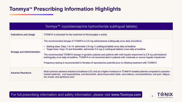 Tonmya TM First - in - class, First - line Medicine for Fibromyalgia Unique, Sublingual, Proprietary Formulation of Cyclobenzaprine HCl Designed to Optimize Efficacy, Delivery and Absorption 7 Two pivotal studies demonstrated durable reduction in fibromyalgia pain (primary endpoint) Non - opioid analgesic ; not DEA scheduled Rapid drug exposure following once daily sublingual administration, at bedtime Reduced levels of norCyclobenzaprine ( norCBP ), the major metabolite of cyclobenzaprine • norCBP is believed to reduce the effectiveness of swallowed cyclobenzaprine on pain relief Generally well tolerated Patent Protection / Exclusivity: Tonix owns worldwide rights to Tonmya TM with no royalties. In the US, issued composition of matter patent extending to 2034; pending method of use patents may extend exclusivity to 2044